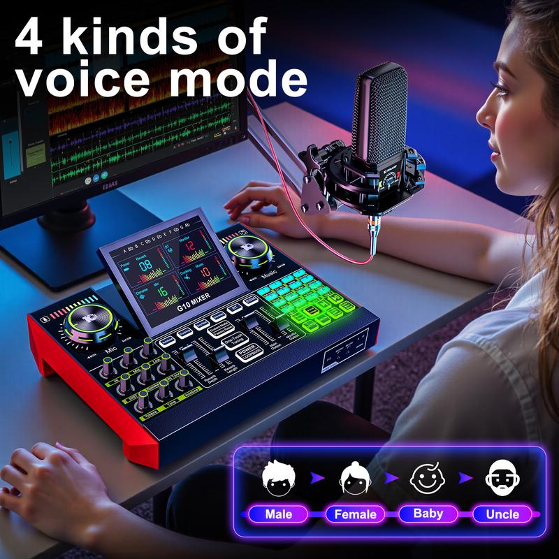 ·Special Features: G10 podcast mixer can save your different voice modes, including the parameters of the all of volumes, all of voice effects, a total of 19 modes can be saved, great for different scenes need. Just you set up,save, switch to it, and you live stream or podcast with it.