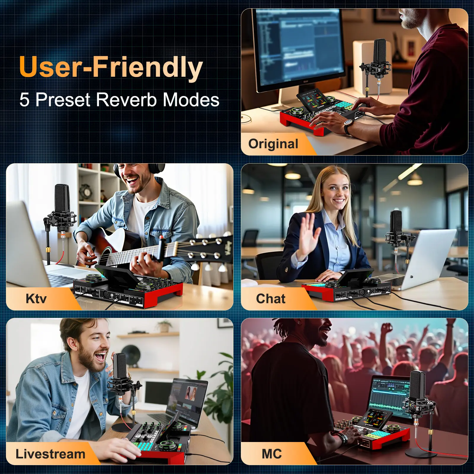 【Sound Board for 3.5mm/6.35mm Dynamic/48V Microphone】No complicated setup required! Just plug the live sound card into your PC, Mac, or mobile device, and start streaming or recording right away. This pod cast equipment kit is designed to make your audio experience seamless and easy.
