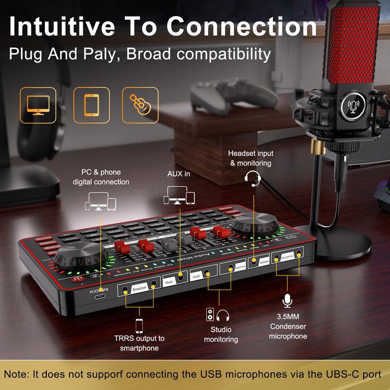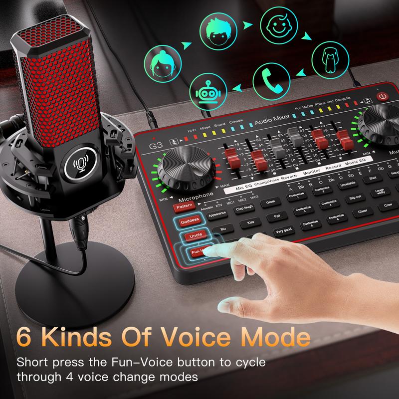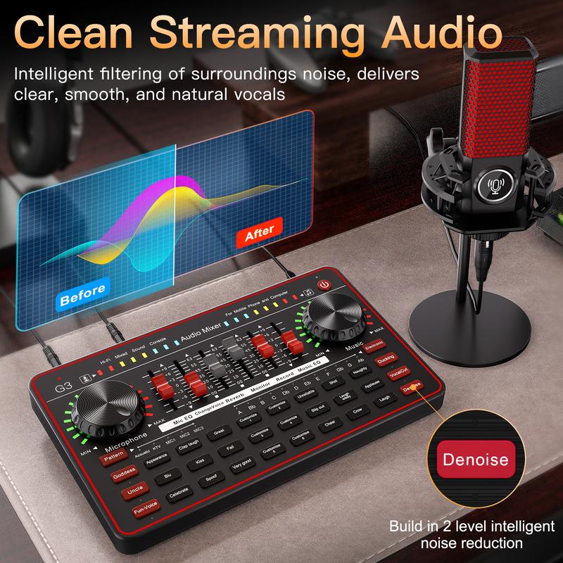【Plug and Play】: Combine USB sound card and audio DJ mixer equipments in one. It delivers wonderful High-fidelity sound quality and offers adjustment button to optimize vocal and sound effects. The G3 sound board comes with a studio recording microphone, Plug and Play, No Driver Required, which allow you start podcasting or live streaming easily. Start recording when you plug into the smartphones or PC/laptop.