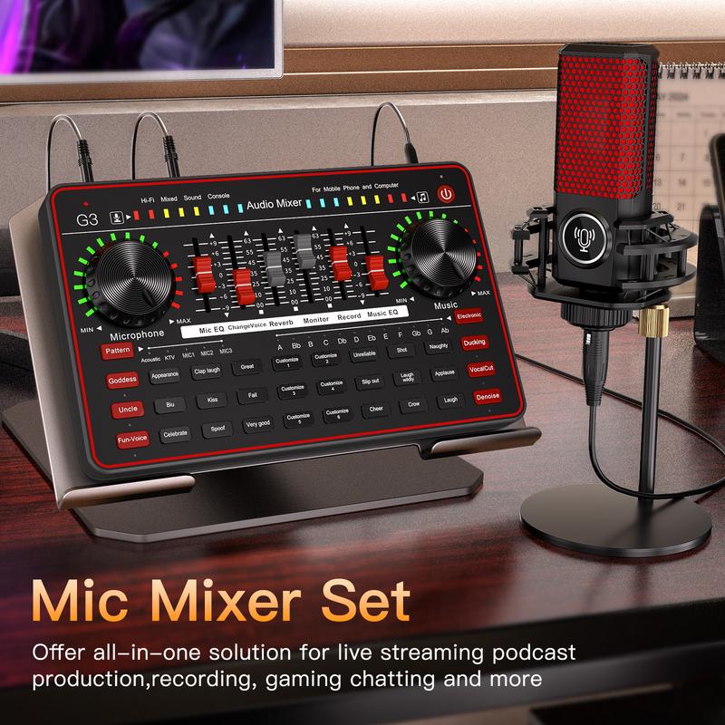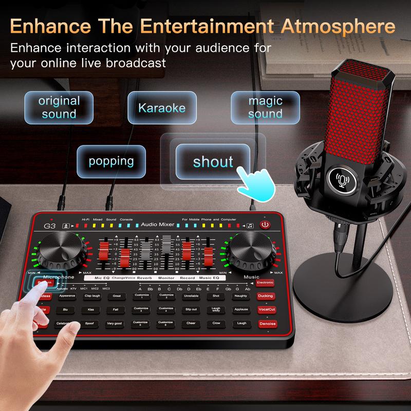 【You Will Get】 1* G3 Live Sound Card, 1* L3 Black/Red Condenser Microphone, 1* 3.5mm Earphone, 1* Mic Foam Cover, 1* XLR to 3.5mm Cable, 1* Mic Shock Mount, 1* Desktop Microphone stand, 1* USB Data Cable, 3* 3.5mm to 3.5mm TRRS Audio Cable, 1* User Manual(Detailed E-version manual below the link).