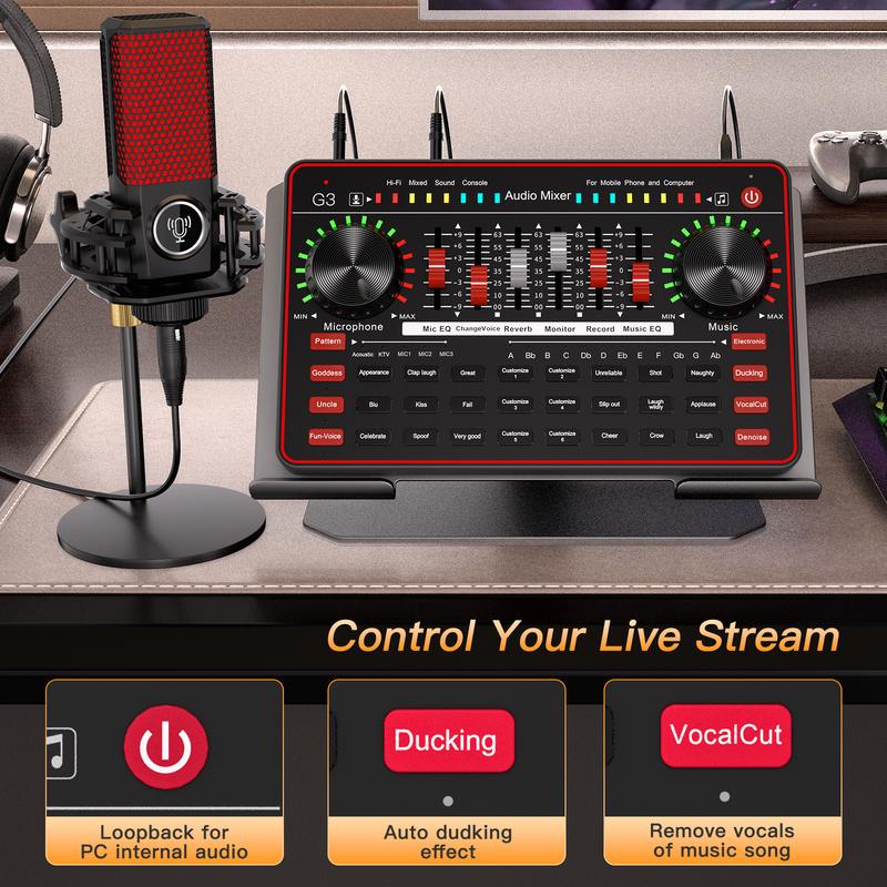 【Friendly to beginners】G3 Sound Card built-in three practical functions. Turn on the Loopback function to input sound from the computer. The Ducking function can automatically reduce the background music volume when you speak. The BGM function can eliminate 95% of music leadsinger's voice into backingvocals with one click.
