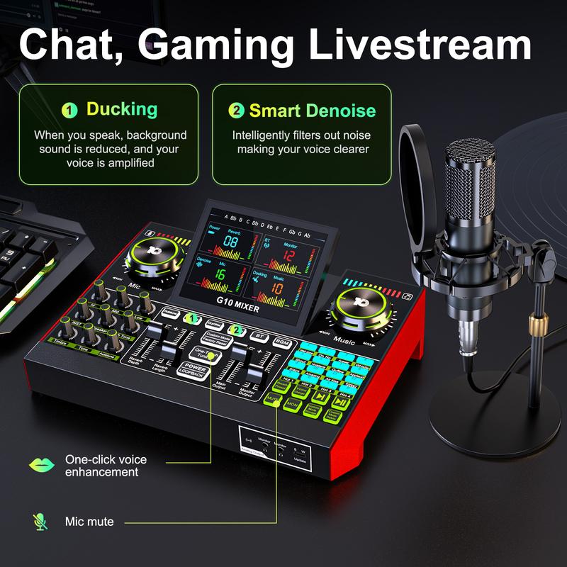 【Podcast Equipment Bundle】The podcast microphone bundle includes everything you need for professional-quality audio creation: a 3.5mm condenser microphone with a disk bracket and the G10 Sound Board. Perfect for podcasters, gamers, streamers, and content creators who want an all-in-one solution for mixing, recording, and streaming.