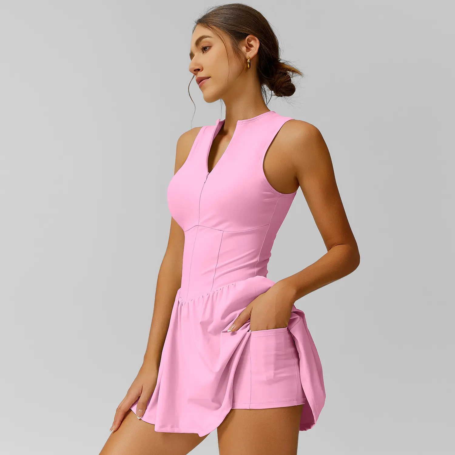 It is a cute dress however I dislike the zipper. I feel like I am gonna break the zipper every time I try to unzip or zip it up. It is also a little see through. You have to wear a skin tone bra underneath or you will be able to see your bra. Overall I wouldn’t purchase again.