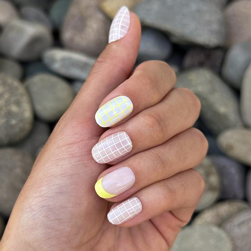 A super sporty mixed mani with grid patterns, frenches, and solids in a short round shape.“This tennis inspired mani always aces it.” XO SGT