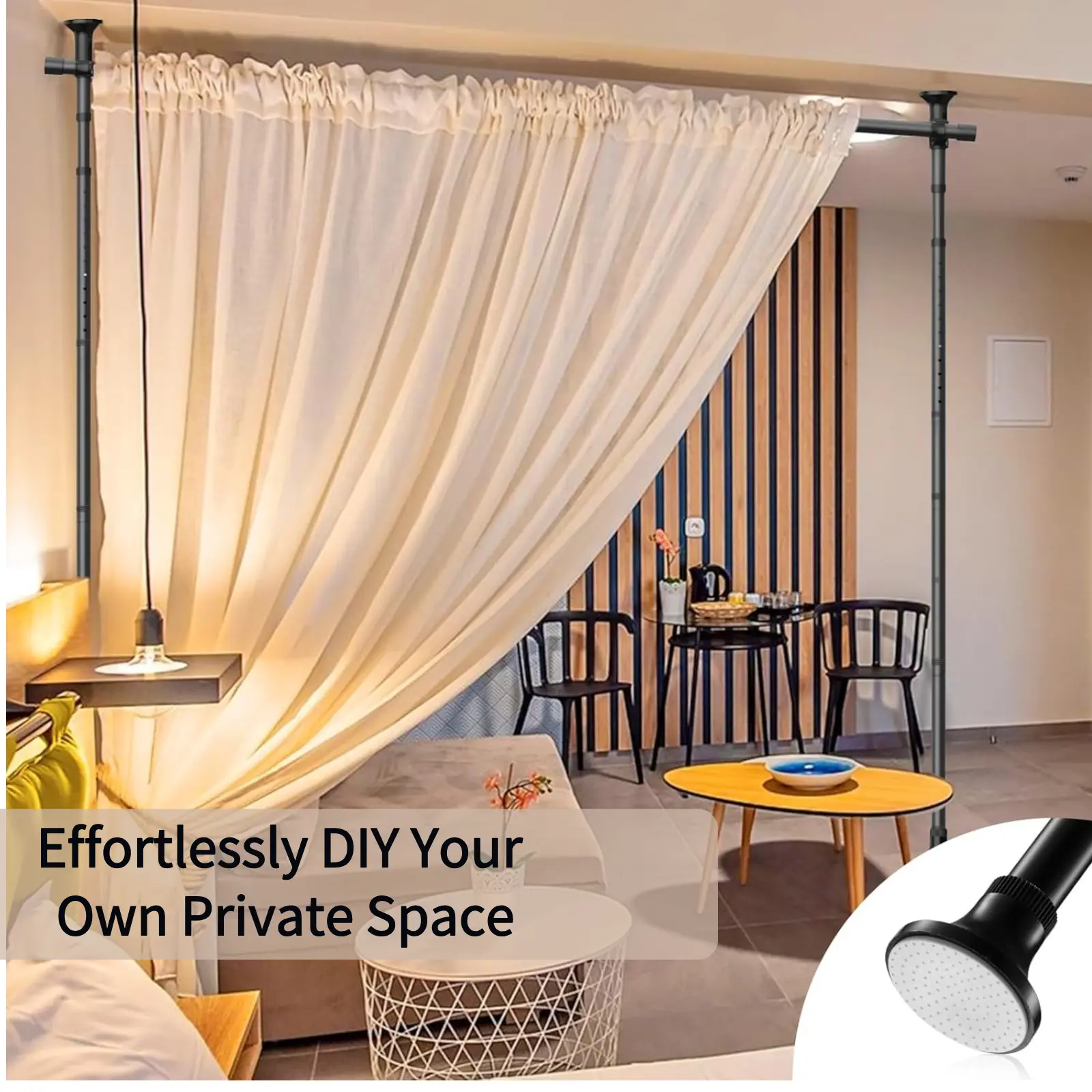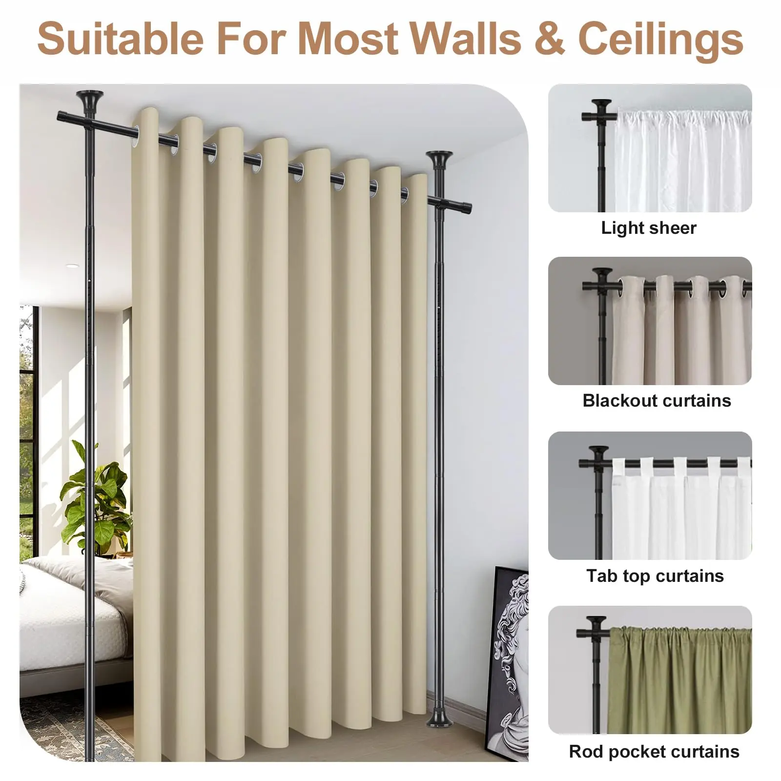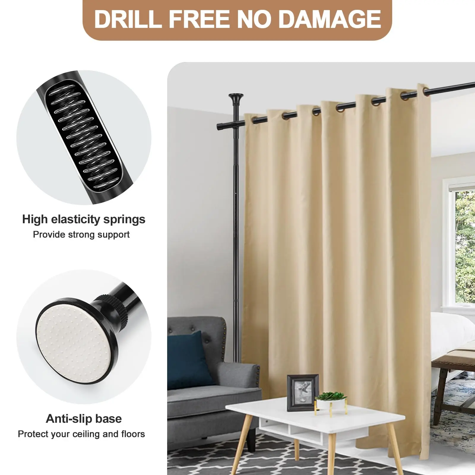 Completely Damage-Free: No-drill design with anti-slip base,the room divider protect your ceiling and floor from scratches.Suitable for a wide range of surfaces such as wooden ,marble,tile,plaster