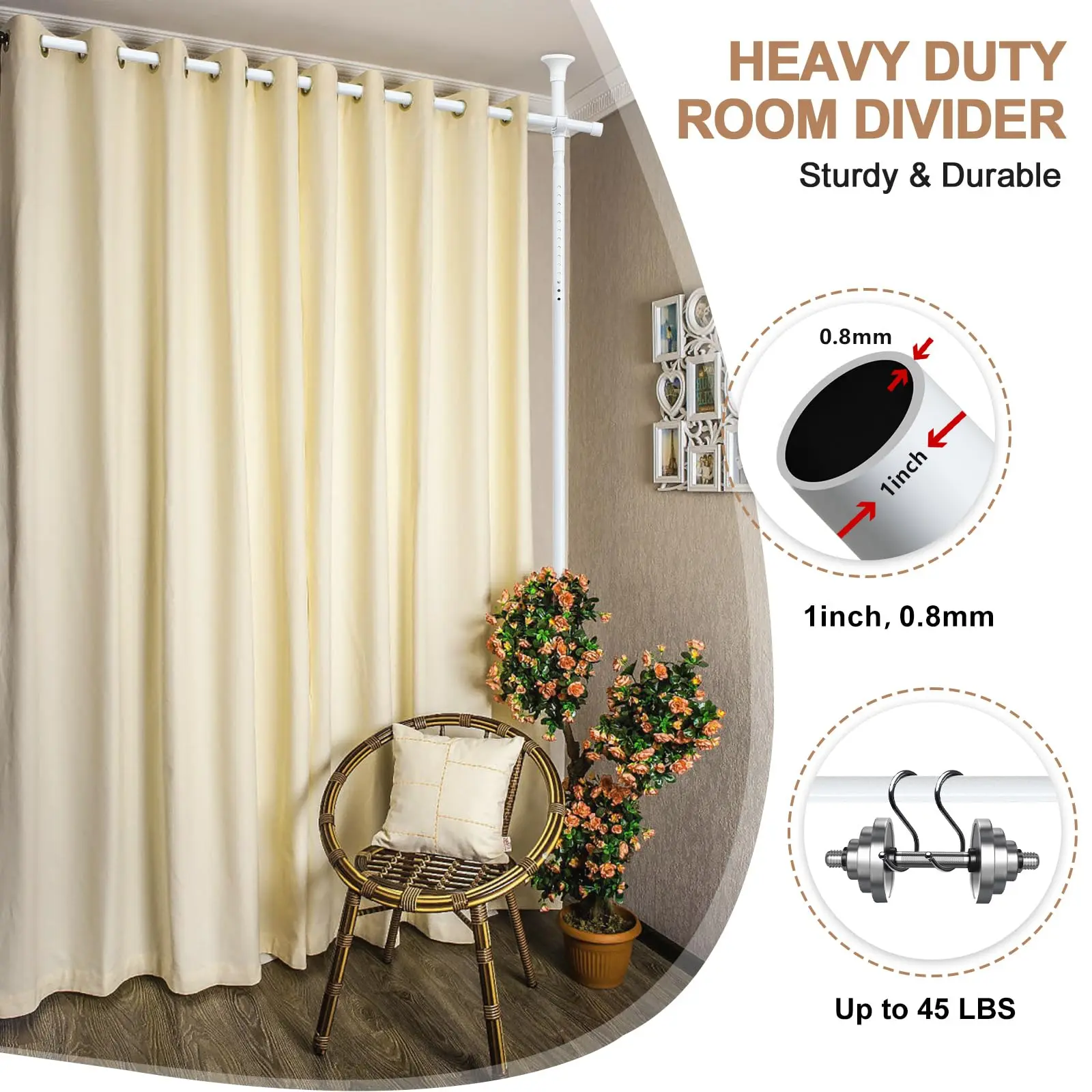 Durable and Sag-Proof: Heavy-duty stainless steel construction (0.8mm thickness, 1-inch diameter) allow this room separator supports blackout room divider curtains up to 40lbs and more without sagging