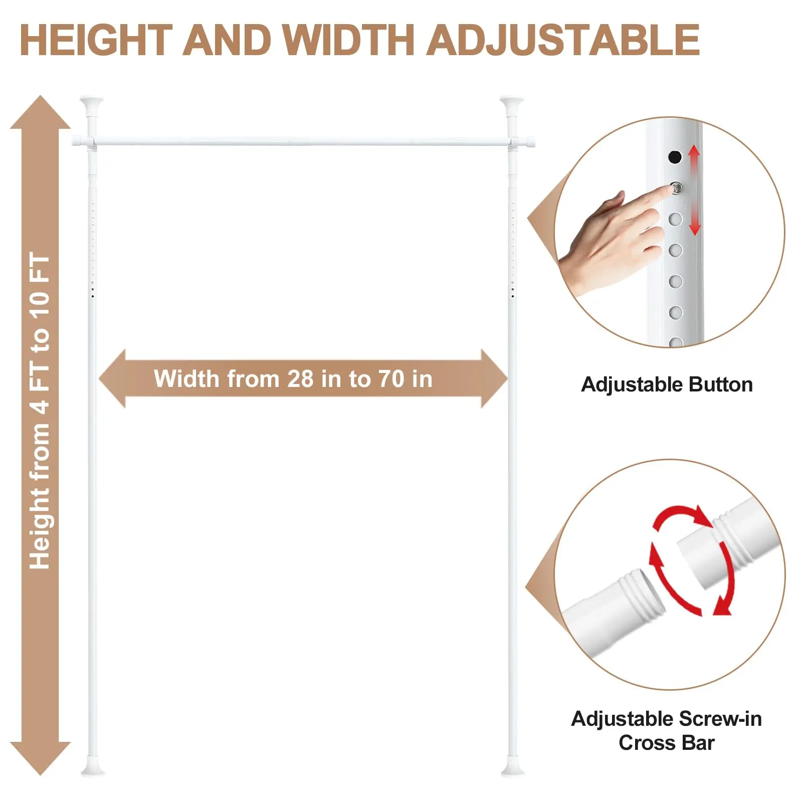 Customizable Fit: Adjust width 28-96 inches (2.3-8 feet)and height 48-108inches (4-9 feet) to fit any space. Portable and adaptable to different floor and ceiling heights