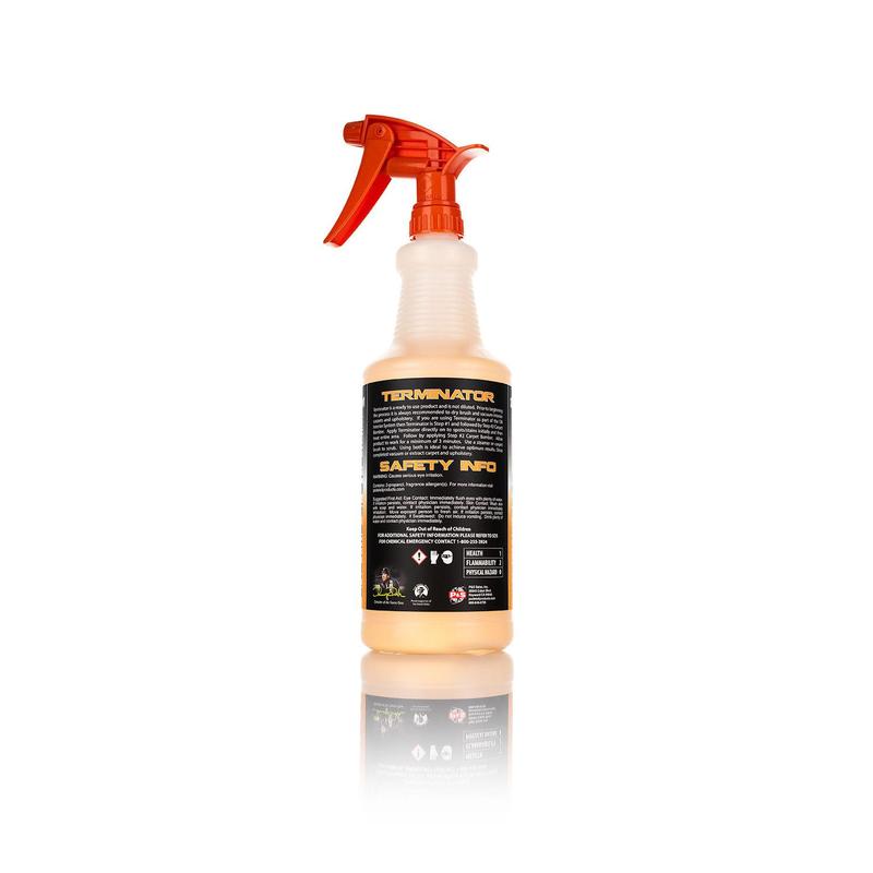 This uniquely-formulated product is a blend of dry and wet cleaning chemicals and degreasers that quickly remove spots and stains. Terminator cuts grease, oil, dirt, and food-related stains. Use Terminator to pre-treat spots and stains on carpet and upholstery prior to shampooing.