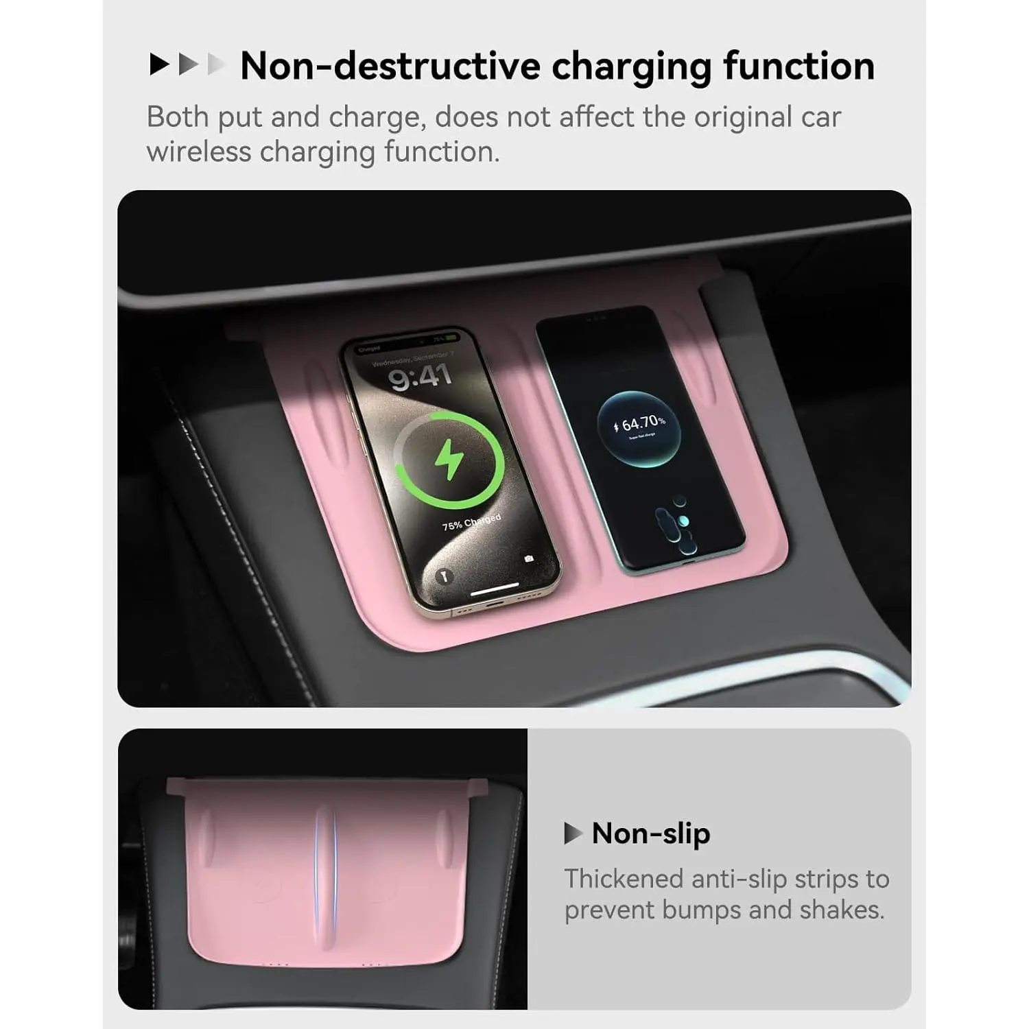 [Worry-free Use]The tesla center cosnole silicone mat do not interrupt the phones charging.The Center screen protector ring do not affect the use of the display screen.