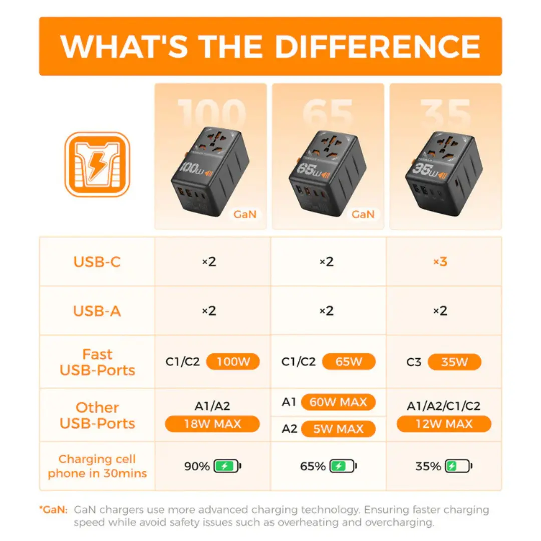 ·GaN 65W USB C Port: USB C1/C2 offer 65W MAX charging, USB-A1 up to 60W. Charge your phone up to 65% in 30 minutes. Ideal for cellphones and tablets, ensuring quick and efficient charging on the go.