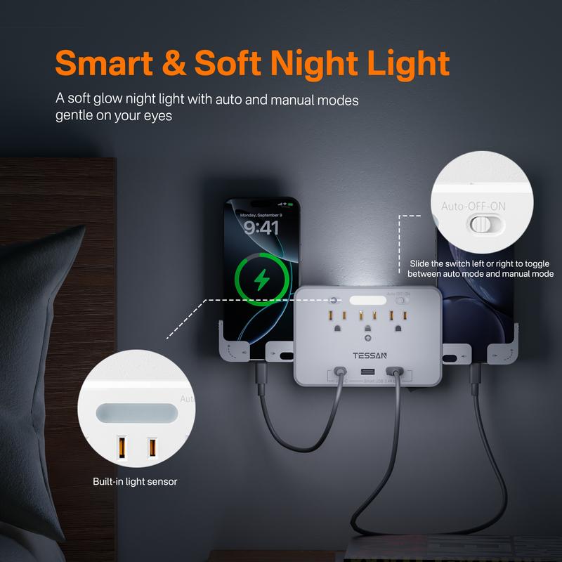 🌟 Tessan Wall Outlet Extender with Phone Holders Night Light