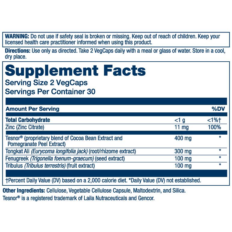 Backed By Science. Built For Men: This potent hormone-free testosterone support formula features clinically studied, plant-based ingredients like Tesnor®—a proprietary blend of cocoa bean and pomegranate peel. Tensor supports muscle health and testosterone levels, with tongkat ali and zinc to support the normal production of testosterone.*