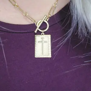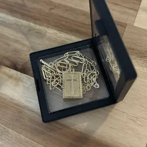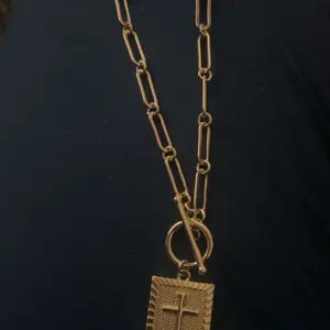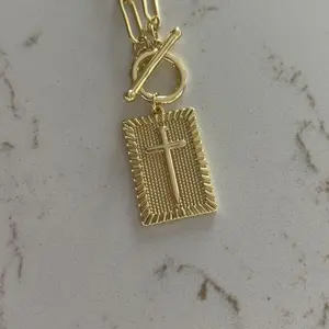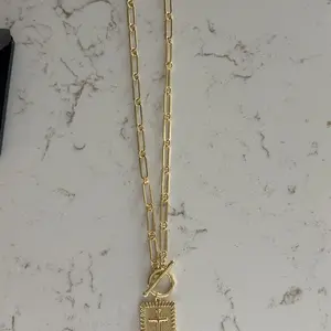 I love this necklace! It looks elegant, has a nice weight to it, and the gold color is gorgeous in person. The cross charm and the engraved back make it feel extra special. Perfect for everyday wear or dressing up. Great quality for the price!