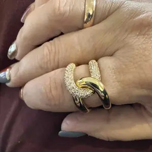 This ring features a double row of zirconia stones, creating a stunning interlocking knot design. The smooth band adds a touch of sophistication. Perfect for stacking, it's ideal for summer and back-to-school outfits. Enhance your jewelry collection with this versatile piece.