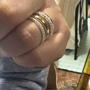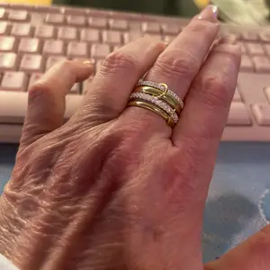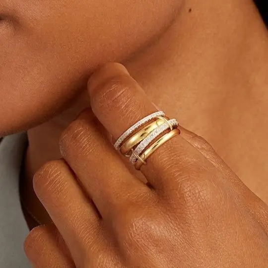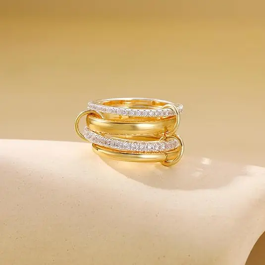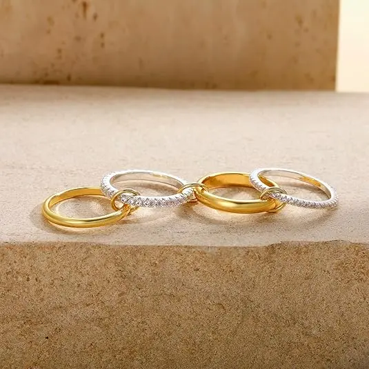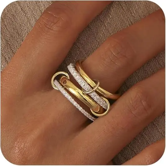 ✨ Our four-tier interlocking rings redefine modern luxury. Contrasting gold hoops and cubic zirconia create bold yet elegant designs. Perfect for women who love unique styles. These rings are ideal for stacking, enhancing your look effortlessly. Choose from sizes 6 to 10 for a perfect fit.
