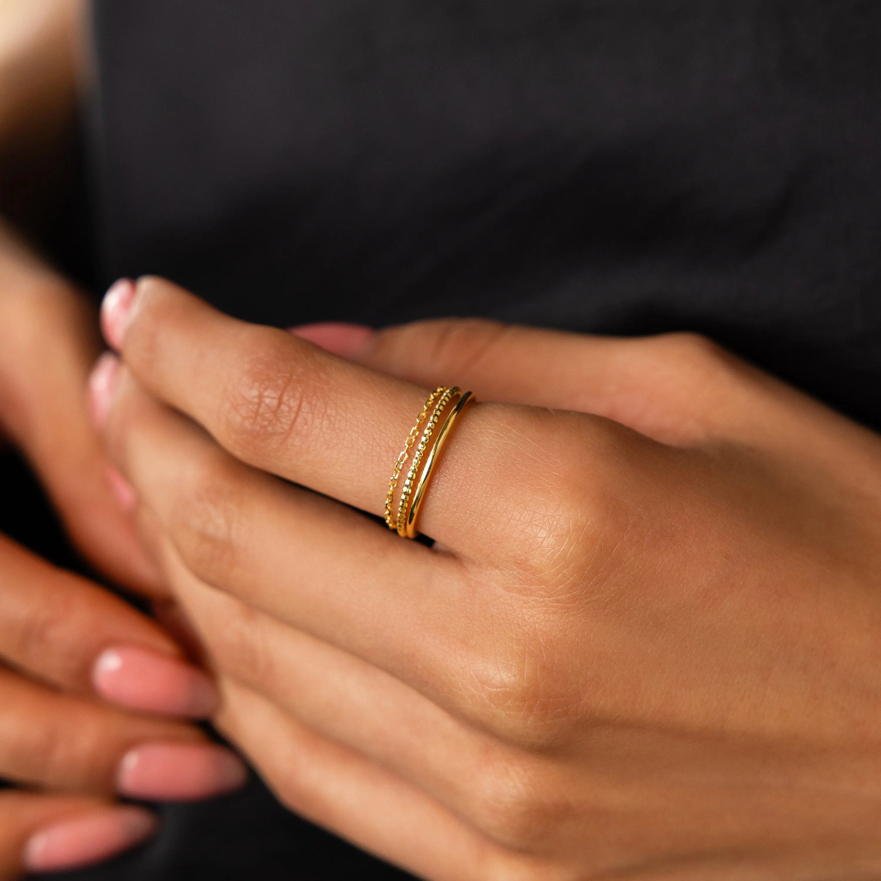 ·Featured Styles: Model showcases a minimalist, stacking look featuring our Sprinkle Diamond Ring, Thin Stacking Ring Set, and Knot Ring