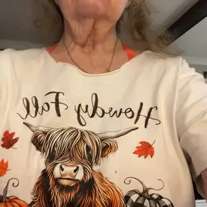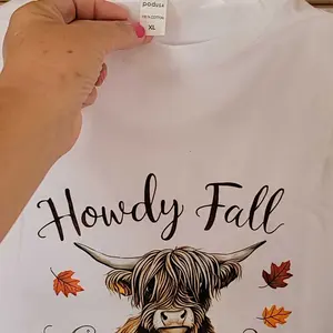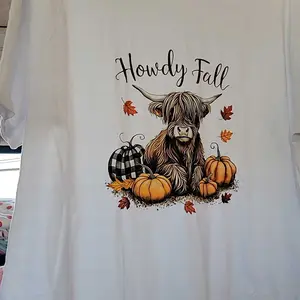The cutest, sweetest little tshirt 🐂🧡🍂🍁 Clean, white, crisp tshirt with the fall colors and cozy feeling. I'm so happy with this purchase!