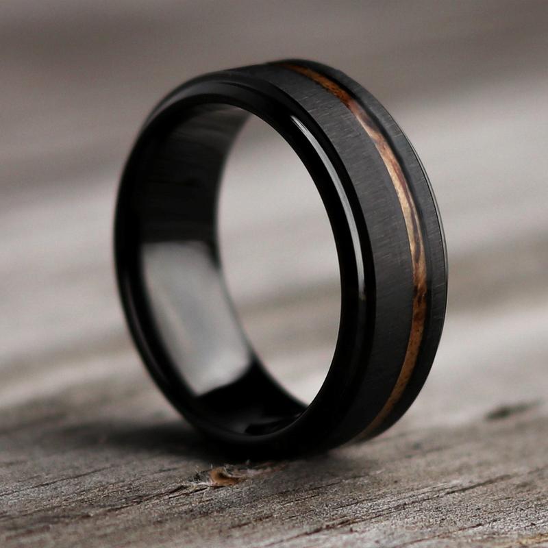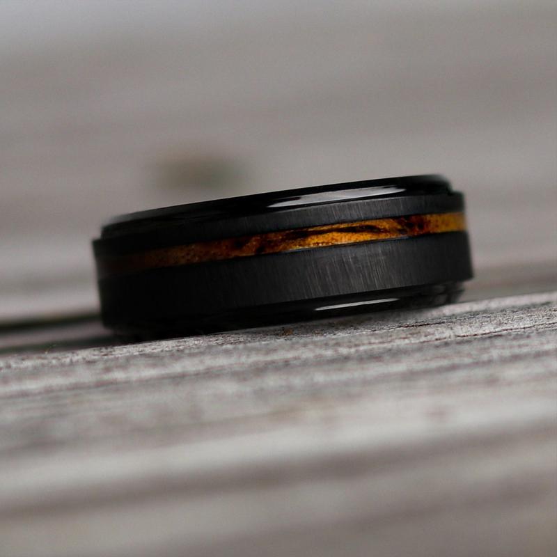 | Tungsten and Koa Ring | Hawaiian Koa is widely regarded as one of the most beautiful timbers in the world. Its grain runs from dark coffee heartwood, through bright golden tones. This design is paired with a brushed plumb black, beveled Tungsten carbide band.
