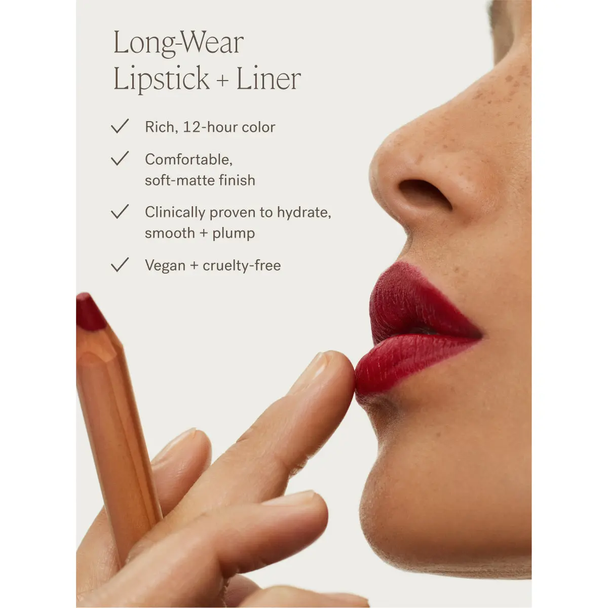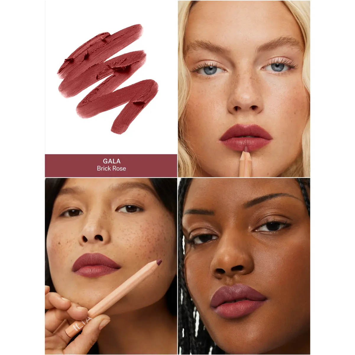 Lip Sketch Hydrating Crayon in Gala glides on smoothly, delivering a rich, brick rose shade with a soft-matte finish. The hybrid liner + lipstick lasts 12 hours and is clinically proven to hydrate, smooth, and plump lips over time.