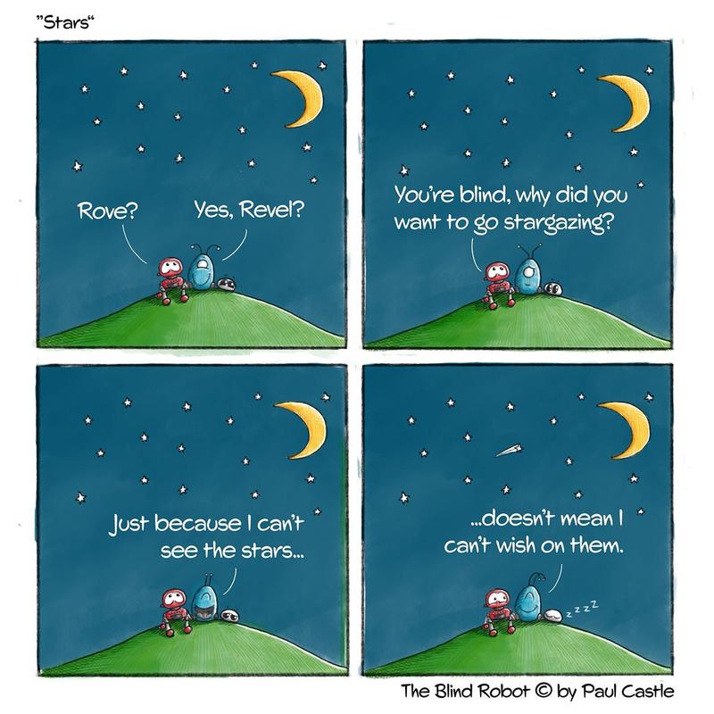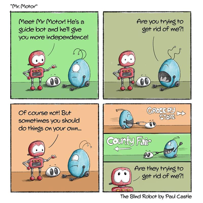 "The Blind Robot" is the unique cartoon creation of blind illustrator, Paul Castle. Rove is a blind robot with heightened senses and a lovable “guide bot” named Mr Motor. Revel is a fully sighted robot with a love of toast and a special knack for making mixtapes. Together, this trio of mechanical misfits form an interabled friendship like no other!