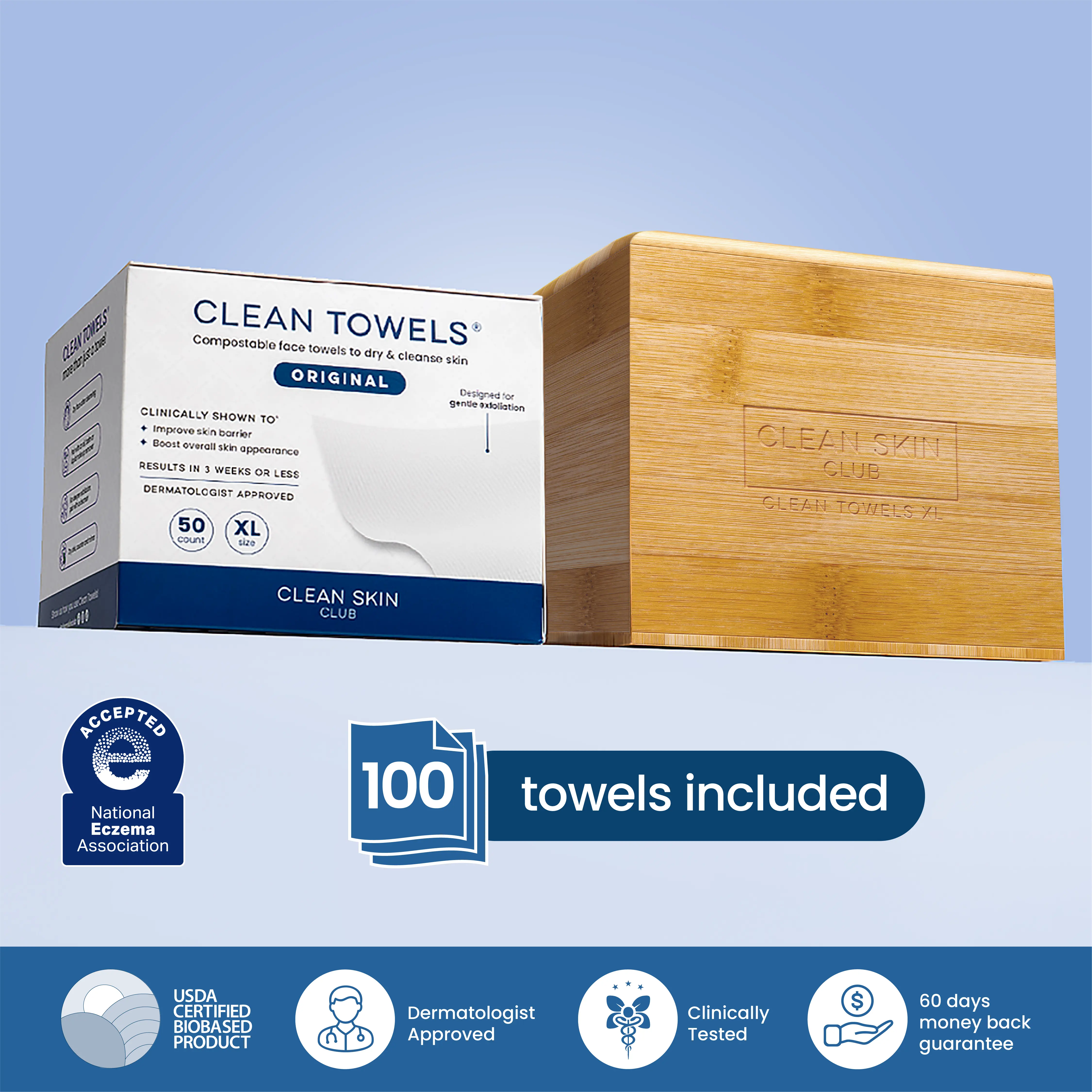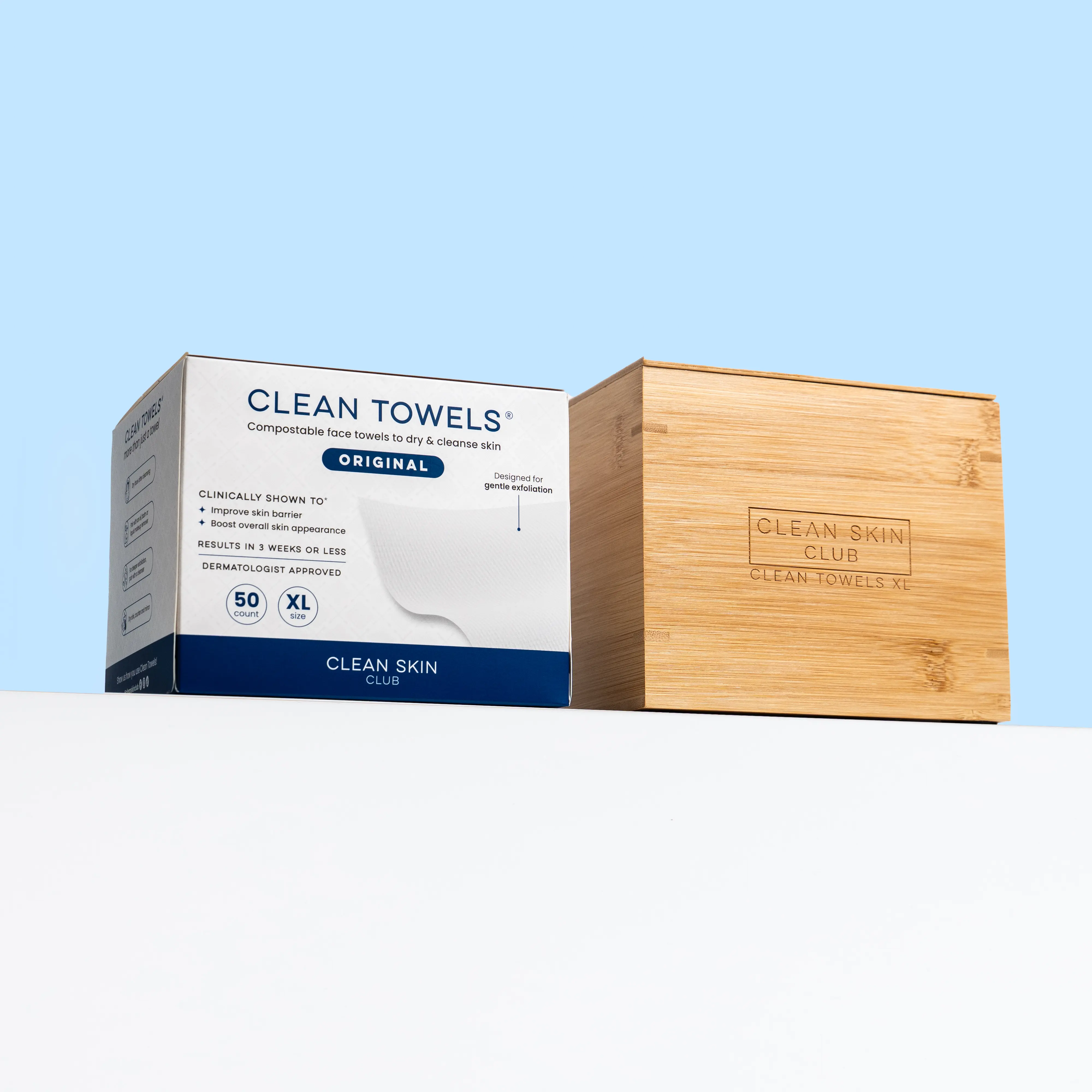 Clean Towels XL are clinically shown to improve 100% of overall skin health. They are the original disposable, ultra-soft, and bio-based face towel, approved by dermatologists. Unlike regular towels, Clean Towels are scientifically designed for optimal skin health. 🌿