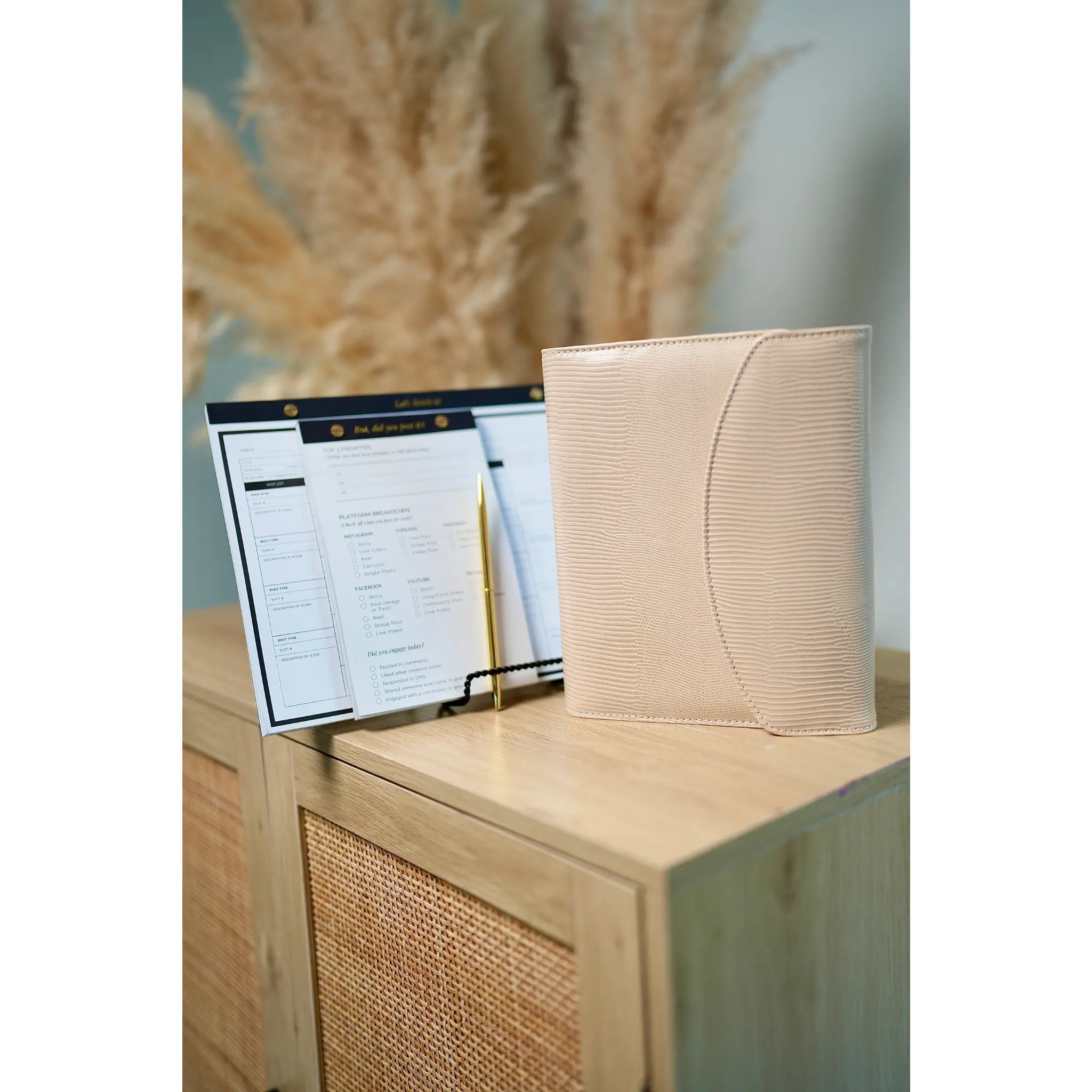 A premium 6-ring A5 refillable planner wrapped in luxe lizard-skin vegan leather with gold hardware.