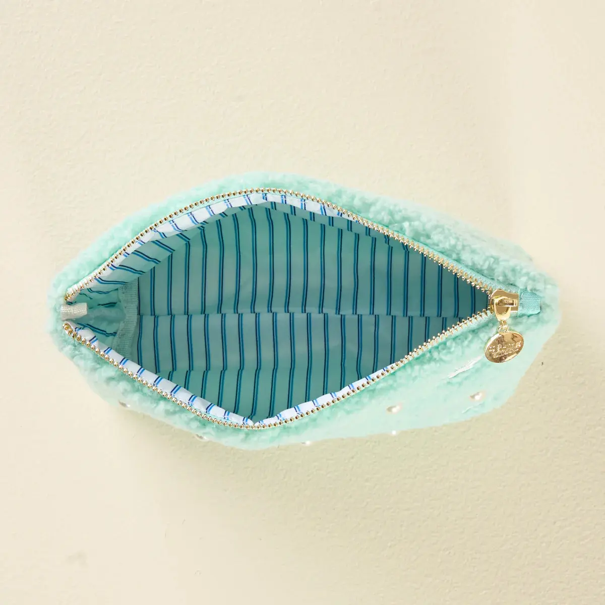 Add a cozy touch to your essentials with our Pool teddy pouch. Crafted from soft sherpa fabric, this pouch features a wipeable lining for easy cleaning, and gold zippers and hardware for a polished look. The interior is lined with a fun printed fabric, making it as stylish on the inside as it is on the outside. A perfect size for keeping your favorite items organized, and can be beautifully paired with our other teddy pouch sizes to create a matching set.
