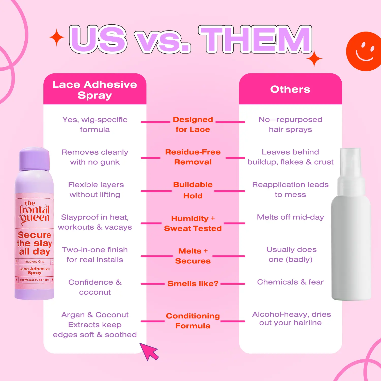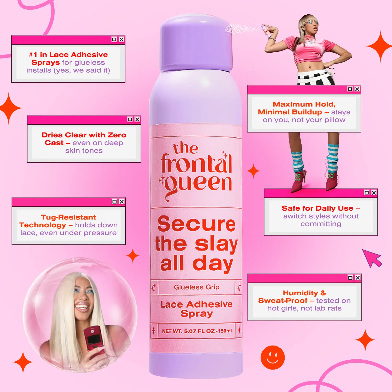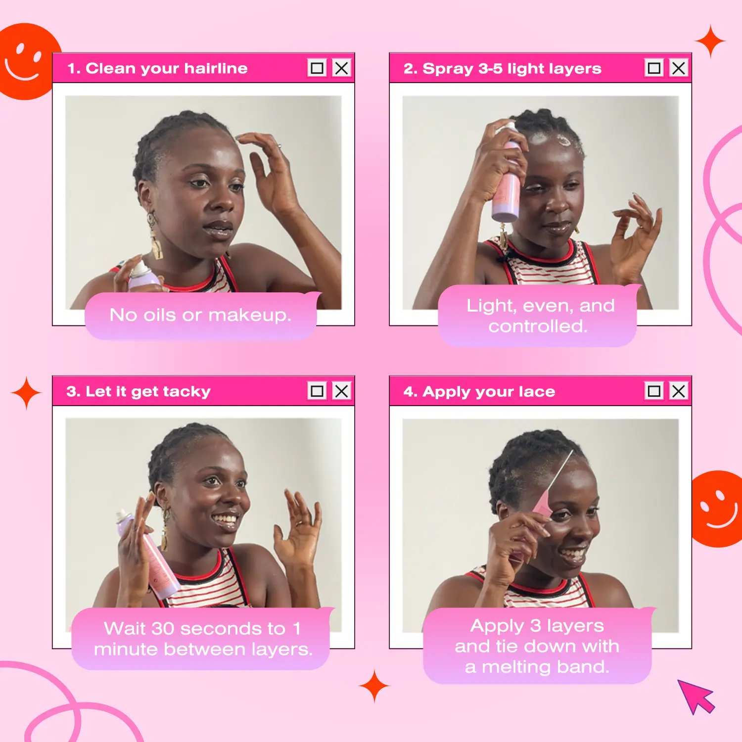 Shake well before use. Prep hairline and spray directly to your scalp. Apply at least 3 layers for the strongest bond. Place wig. For best results, follow with The Frontal Queen Melting Spray for a flawless finish.