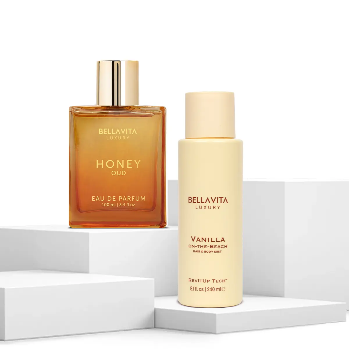 The Golden Dusk Duo by Bellavita Luxury | Honey Oud Eau De Parfum & Vanilla on the Beach Hair & Body Mist | Sweet Oud & Warm Vanilla | Notes of Honey & Tropical Vanilla | Long Lasting Fragrance & Revivable Water Based Mist | Vegan & Cruelty-Free