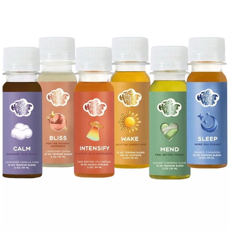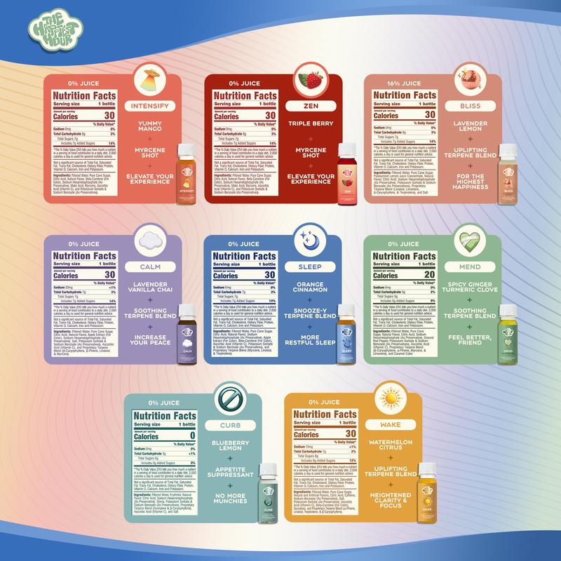 With a selection of our best-selling terpene-infused shots: Wake, Intensify, Bliss, Calm, Sleep, Mend and Curb. You’ll get a taste of different natural wellness benefits, from enhanced focus to deeper sleep. It’s the ideal starting point to discover which drinks help you feel your best, naturally.