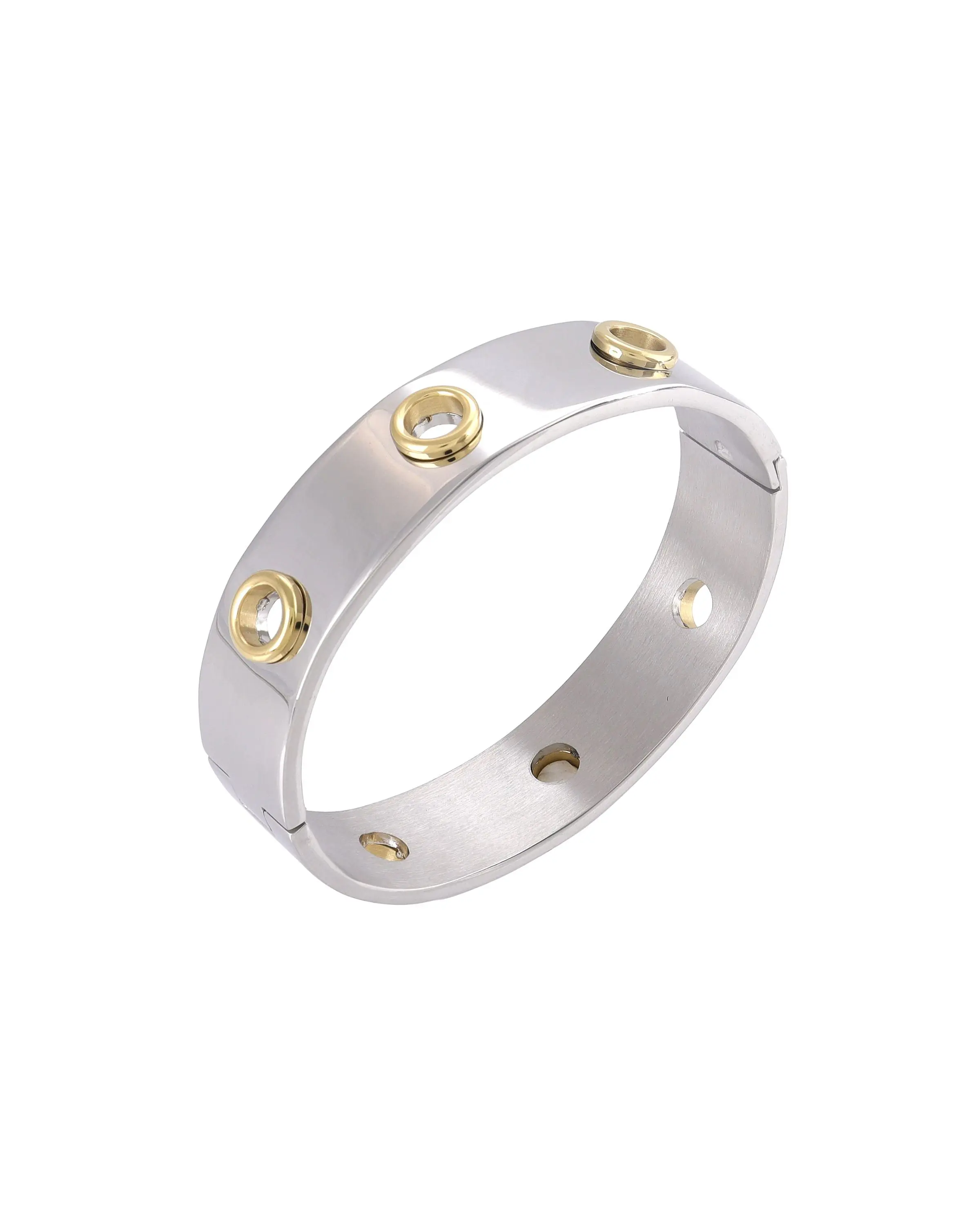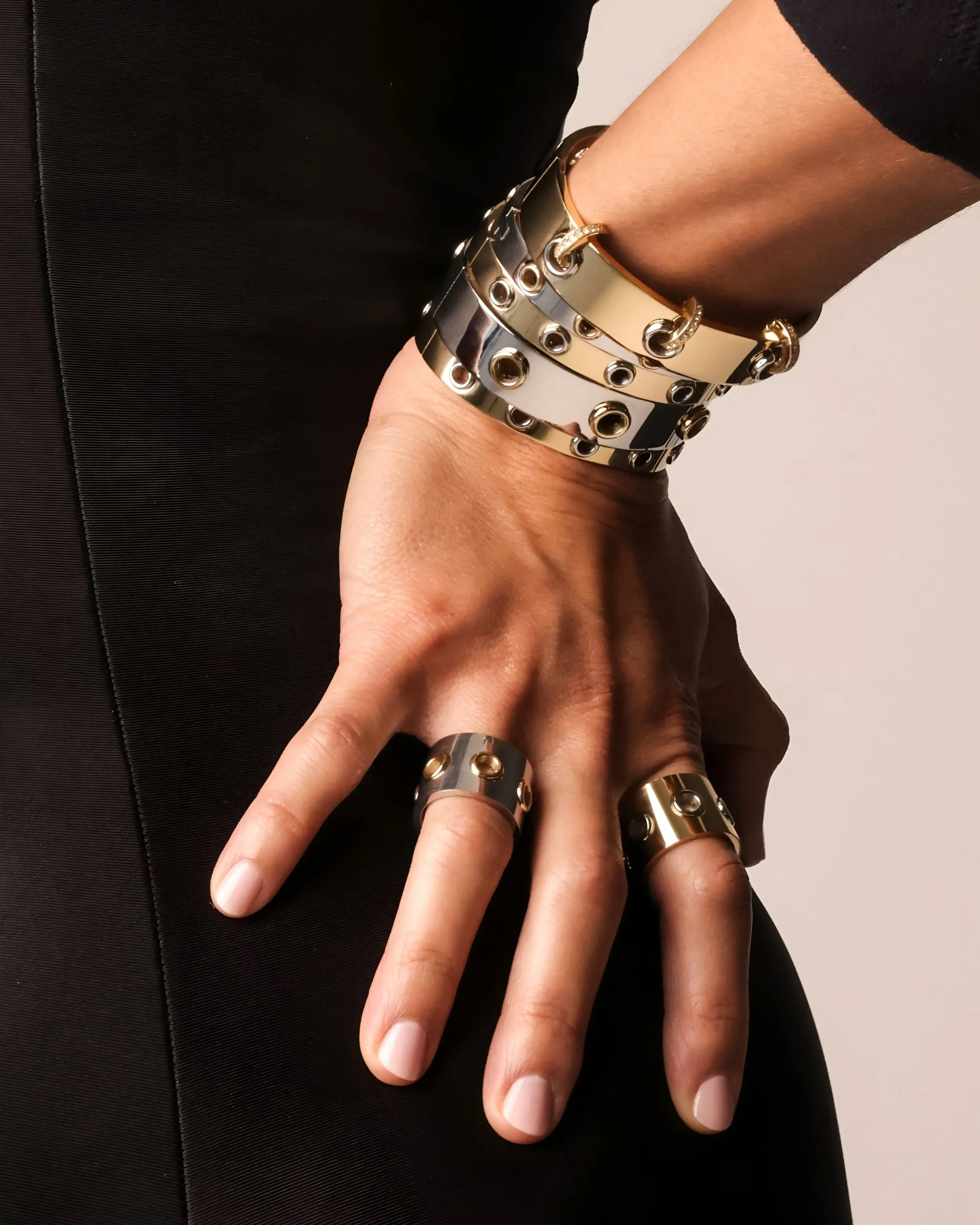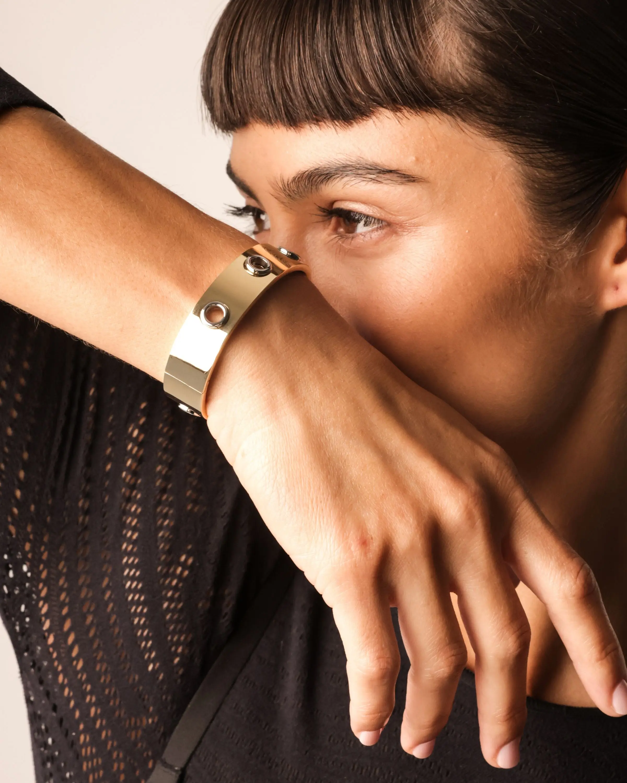 Where absence holds power. This striking bangle redefines minimalism with intention. Crafted from durable stainless steel and finished in rich 18K gold or rhodium plating, it’s all about making space—and making a statement.