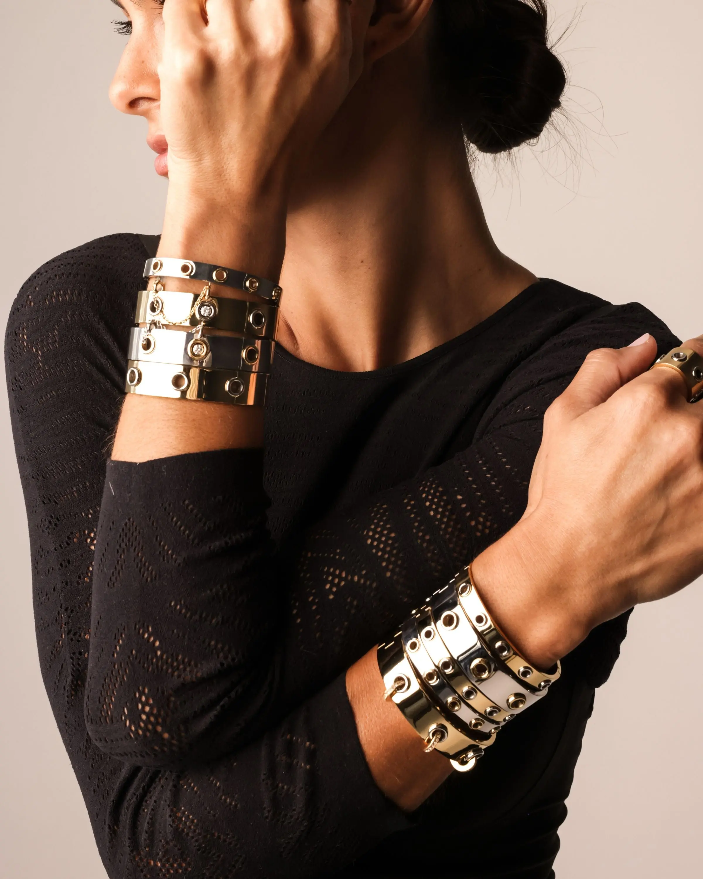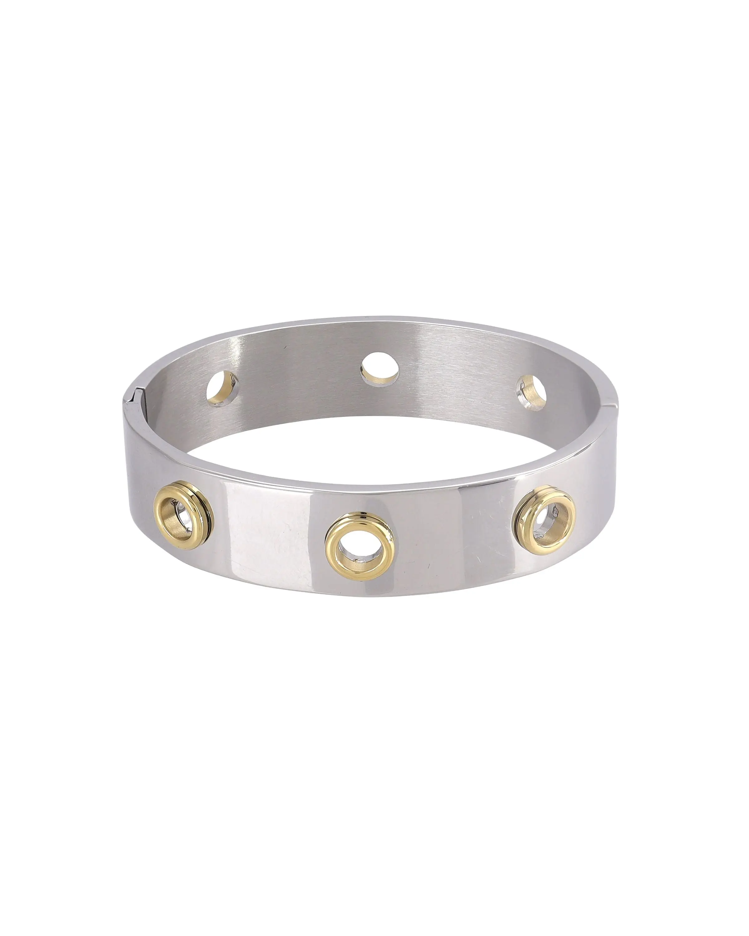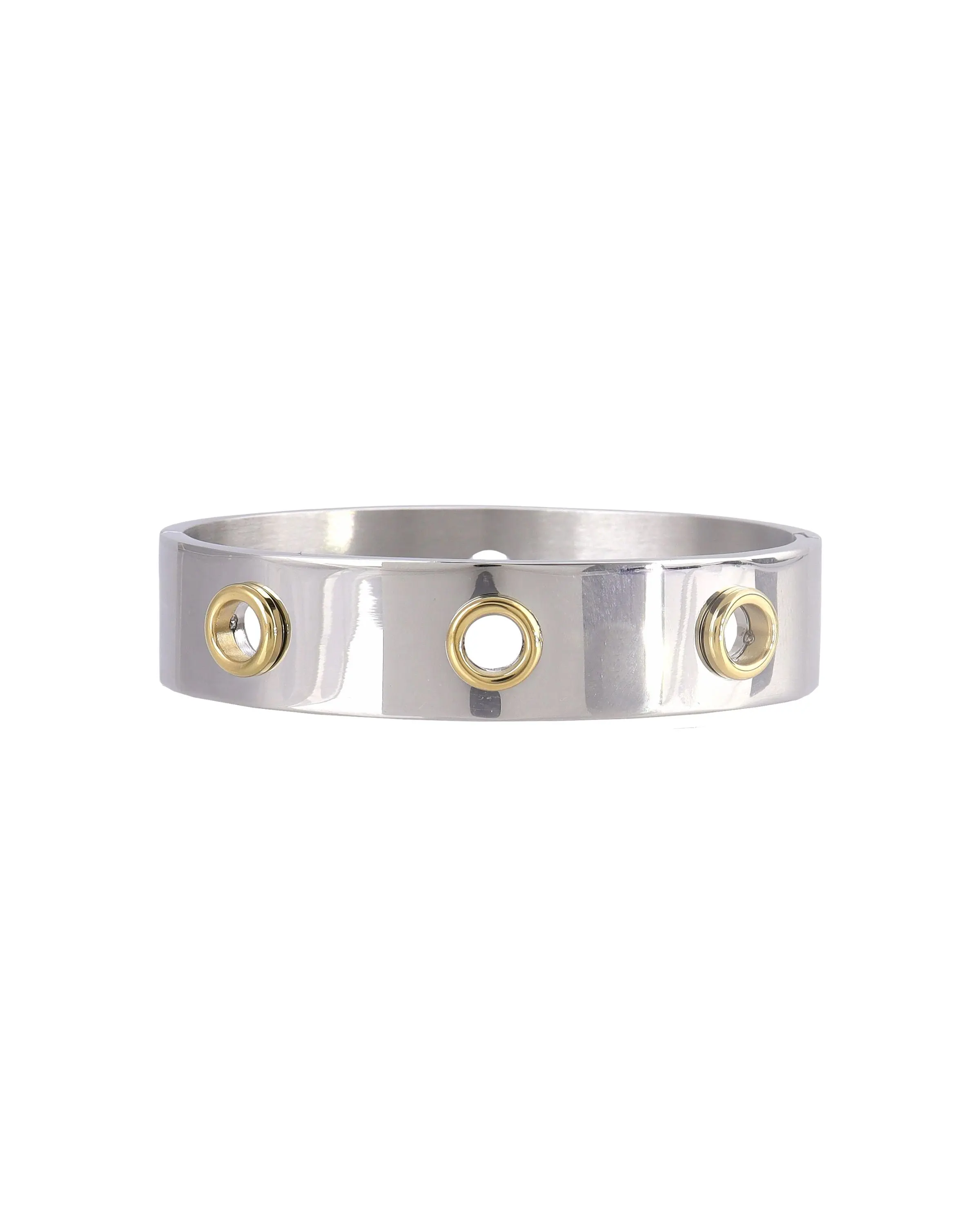 Where absence holds power. This striking bangle redefines minimalism with intention. Crafted from durable stainless steel and finished in rich 18K gold or rhodium plating, it’s all about making space—and making a statement.