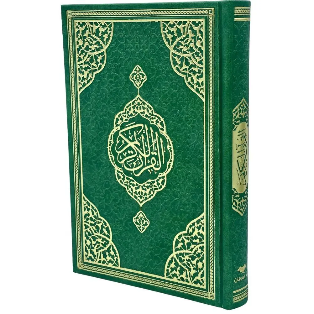 Wrapped in a rich green cover, this Quran features elegant gold trimming along the borders and spine, with ornate golden designs on the corners and engraved patterns that give it a timeless, regal look. The front proudly displays a gold emblem with "Al-Quran al-Kareem" inscribed, making it a stunning addition to your collection or a thoughtful gift.