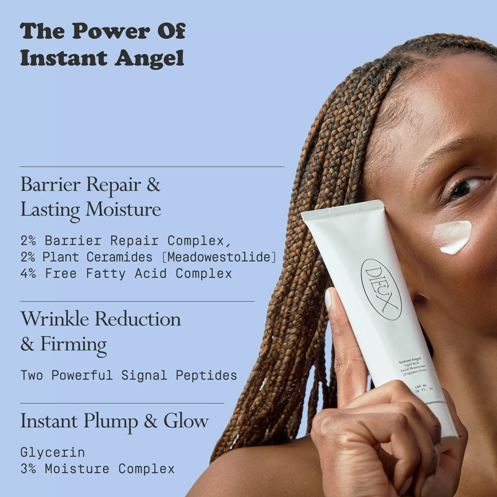 Layer Air Angel to cocoon skin in light, plumping moisture, under Instant Angel, for deep barrier protection. Or, pick and choose for the season. Let Air Angel provide breathable, +12-hour hydration with a satin finish in warmer seasons. Opt for Instant Angel's rich-never-heavy formula to plump and smooth lines and wrinkles with a glowy finish in colder months.