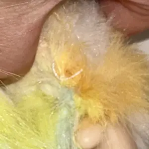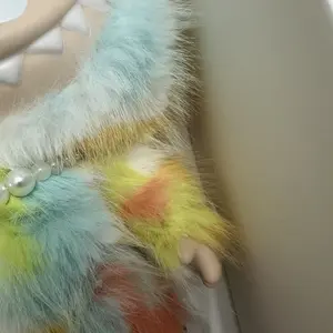 She’s so beautiful and fuzzy. I love how all the colors blend together. The chain is so cute too. She has tiny loops in the back of her head if you want to attach a chain and wear her as a crossbody. In love