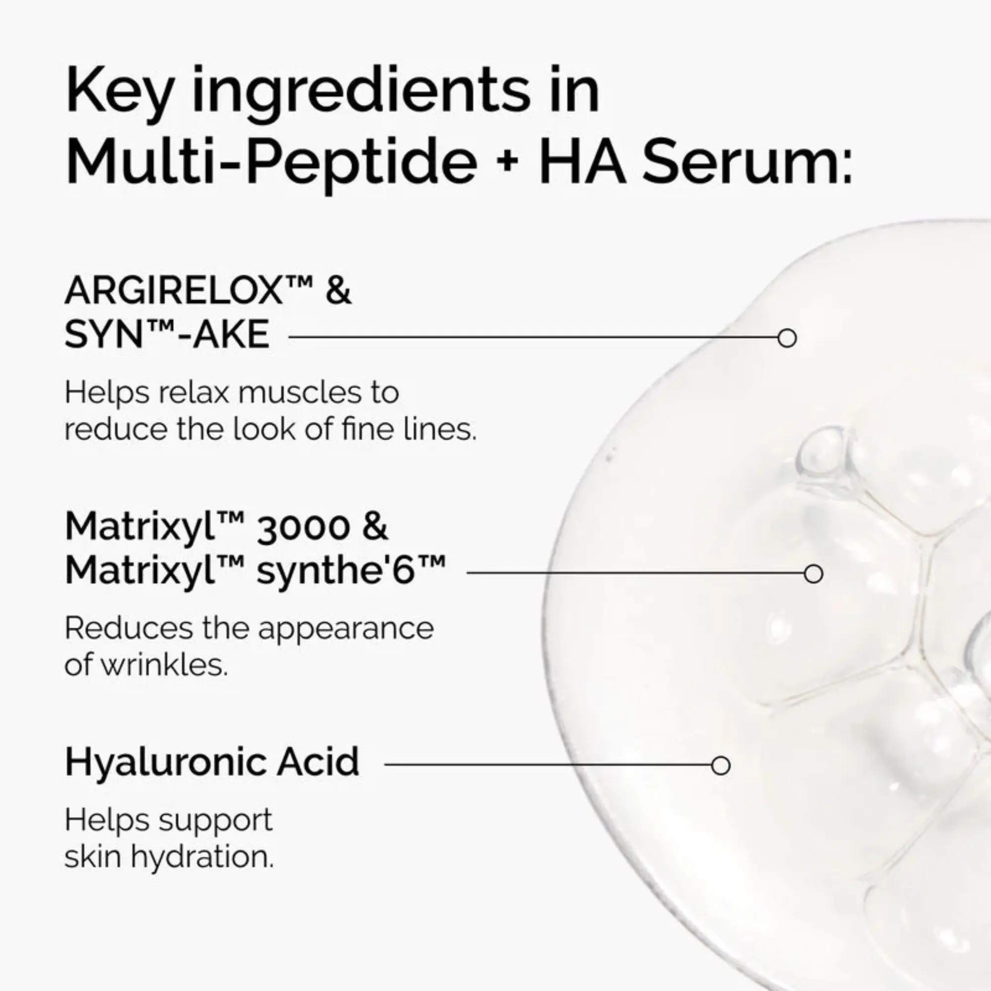 | Ingredients | Multi Peptide Eye: qua (Water), Glycerin, Butylene Glycol, Propanediol, Dipropylene Glycol, Acetyl Glucosamine, Niacinamide, Palmitoyl Tripeptide-38, Acetyl Tetrapeptide-5, Myristoyl Nonapeptide-3, Dipeptide Diaminobutyroyl Benzylamide Diacetate, Caffeine, Epigallocatechin Gallatyl Glucoside, Gallyl Glucoside, Fraxinus Excelsior Bark Extract, Silanetriol, Arginine, Pentylene Glycol, Hydroxymethoxyphenyl Decanone, Propyl Gallate, Maltodextrin, Hydroxypropyl Cyclodextrin, Hydroxyethylcellulose, Xanthan Gum, Citric Acid, Glycolic Acid, Sodium Citrate, Polysorbate 20, Trisodium Ethylenediamine Disuccinate, Dehydroacetic Acid, Ethylhexylglycerin, Benzyl Alcohol, Phenoxyethanol, Chlorphenesin. |
