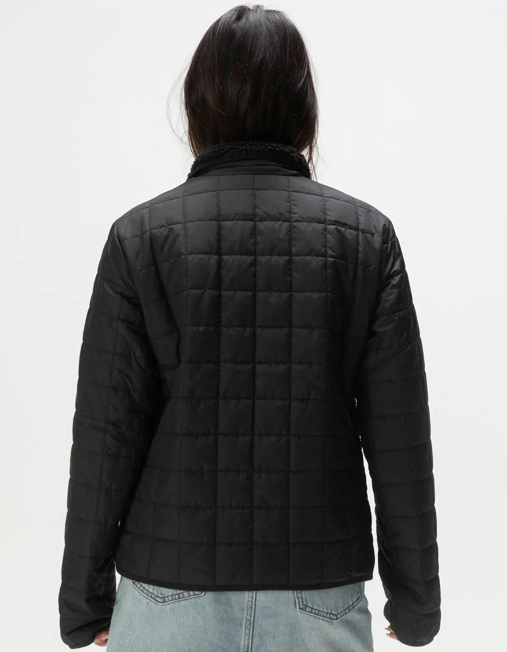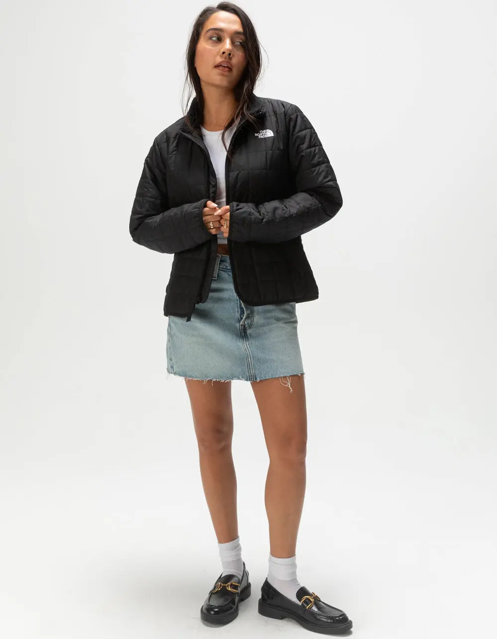 The North Face Junction Insulated Jacket. The Women's Junction Insulated Jacket balances warmth with versatility, and tech with classic good looks, for an easy-wearing layer that feels at home wherever you do. 70% recycled insulation and a water-repellent finish help keep you warm and dry, while The North Face's Circular Design construction means this jacket can be recycled with us at the end of its time with you. Embroidered logo at left chest. Exposed center front zip with an internal draft flap. Heatseeker™ Eco synthetic insulation is made with hollow-core fibers for added warmth, performance and durability. Internal locker loop at back of neckline. Non-PFC DWR finish for added water repellency. Secure-zip hand pockets. Standard fit. Stretch binding on collar and cuffs. Sherpa lined collar. 100% Polyester. Machine wash. Imported. Model is wearing a size small. Model measurements:Height: 5’7” Bust: 34”Waist: 25”Hips: 34.5”