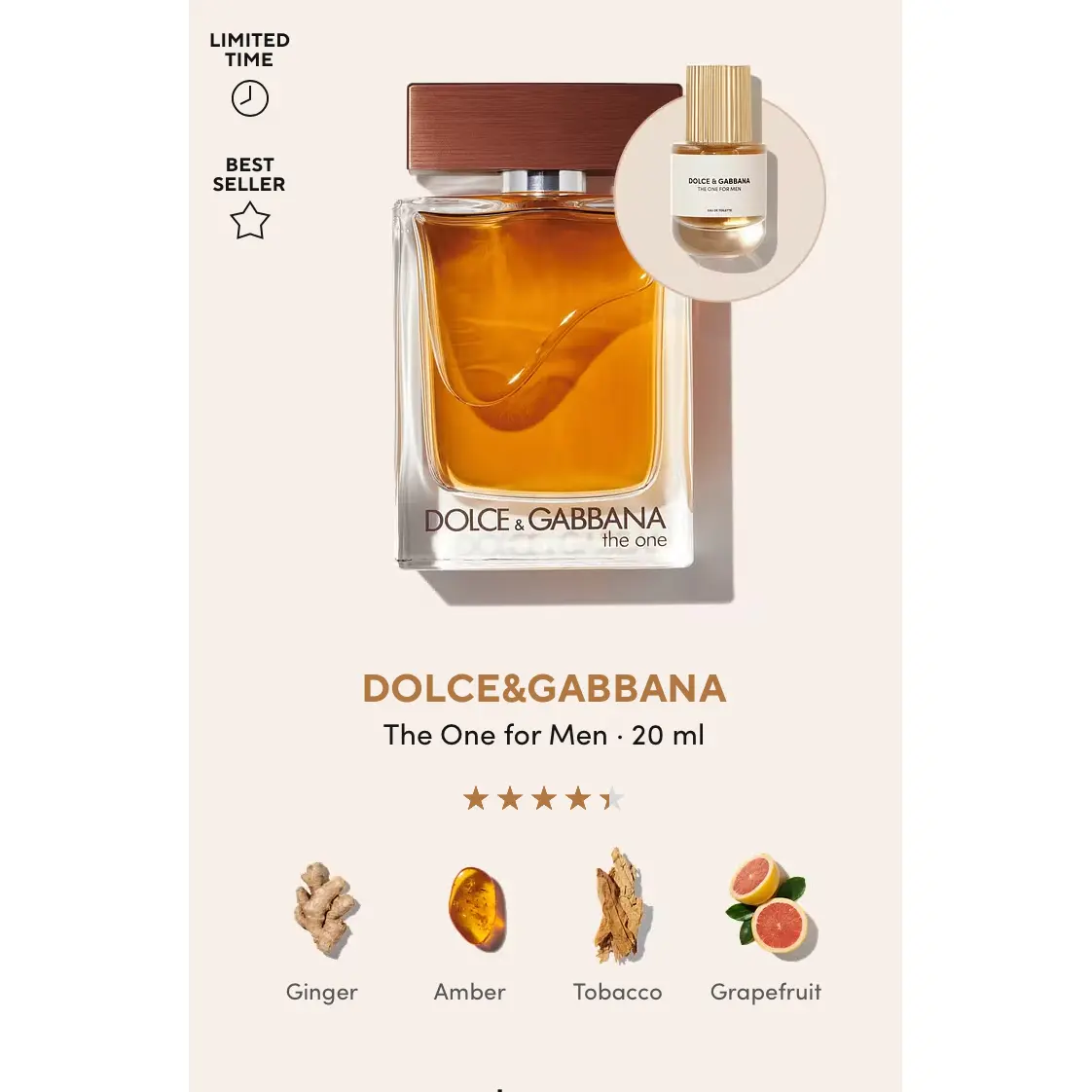 The One is a sweet, spicy, aromatic, plush, sexy Oriental cologne packed tighter than a spice trader’s caravan. Top notes of hazy grapefruit, muscular coriander, and sheer basil set the stage for crisp ginger, the rough pop of cardamom, and subtle orange blossom over dried tobacco and tart cedar.