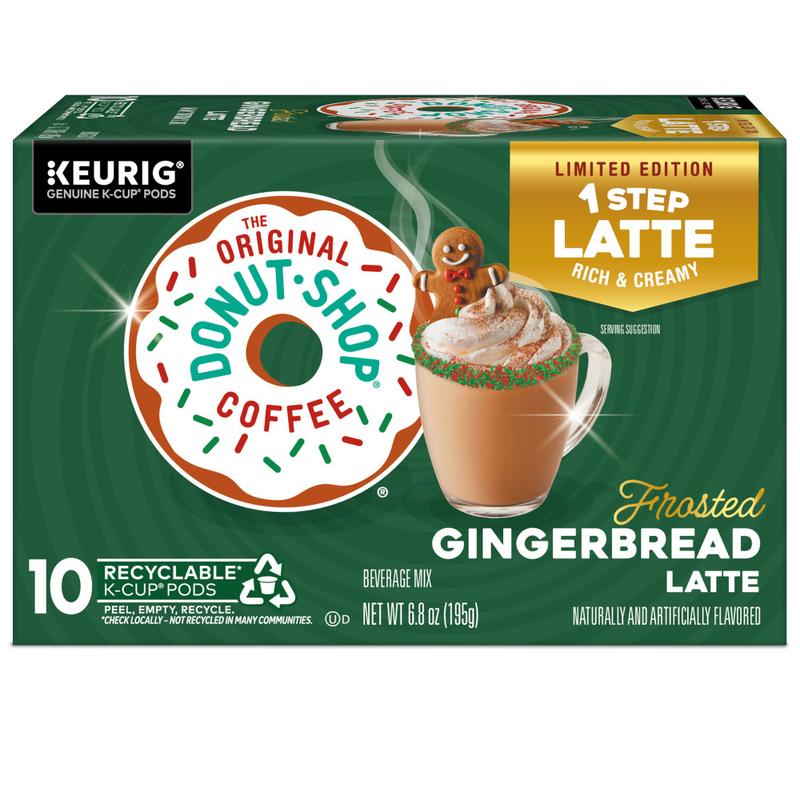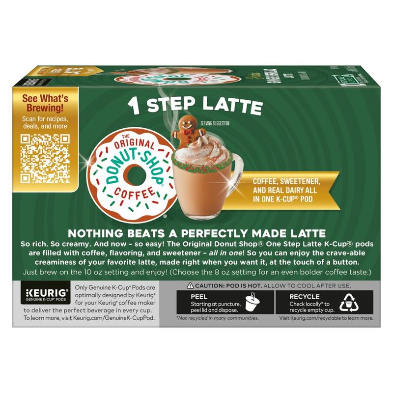 Treat yourself to the merriest of mugs with The Original Donut Shop® Frosted Gingerbread Latte K-Cup® pods with just the push of a button. When they sang “have a cup of cheer,” they were talking about this coffee, overflowing with the flavors of fresh-baked gingerbread, warming spices, and the sweetness of festively frosted icing. So rich, so creamy. And now — so easy! The Original Donut Shop® One Step Latte K-Cup® pods are filled with everything you need to make the perfect latte — coffee, flavoring, and sweetener — all in one! No creamer needed. Just brew on the 10 oz setting and enjoy! Or for an even richer, more indulgent experience, brew on the 8 oz setting. Each K-Cup® pod brews a perfect, great-tasting cup of coffee every time so you can enjoy the craveable creaminess of your favorite latte, made right when you want it, at the touch of a button. These K-Cup® pods are compatible with all Keurig® single serve coffee makers and brew up to 10 oz each. Simple. Delicious. And recyclable.* Enjoy the same great-tasting coffee you know and love, and when you’re done, just peel, empty,
