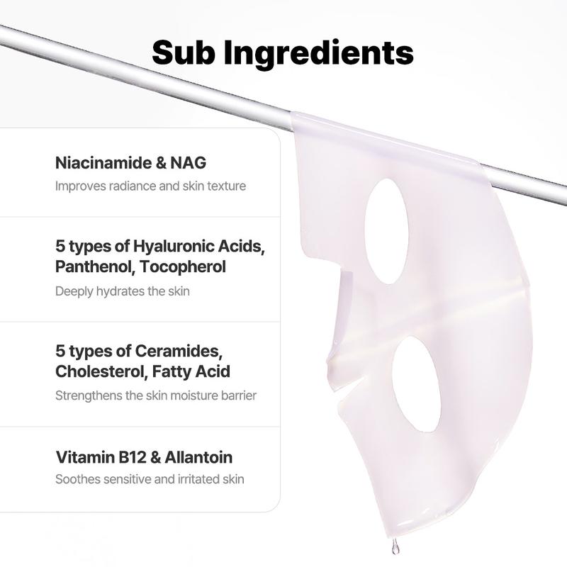 Aqua/Water, Glycerin, Acrylates Copolymer, Niacinamide, 1,2-Hexanediol, Ceratonia Siliqua (Carob) Gum, Chondrus Crispus, Agar, Erythritol, Sclerotium Gum, Potassium Chloride, Sucrose, Cellulose Gum, Polyglyceryl-10 Laurate, Panthenol, Ethylhexylglycerin, Allantoin, Xanthan Gum, Adenosine, Sodium Phytate, Hydrolyzed Collagen, Hydrogenated Lecithin, Cetearyl Alcohol, Cyanocobalamin, Stearic Acid, Tocopherol, Acetyl Hexapeptide-8, Butylene Glycol, Pentylene Glycol, Acetyl Glucosamine, Ceramide NP, Sodium Hyaluronate, Sodium Hyaluronate Crosspolymer, Hydrolyzed Hyaluronic Acid, Ceramide NS, Palmitoyl Tripeptide-5, Phytosphingosine, Cholesterol, Hyaluronic