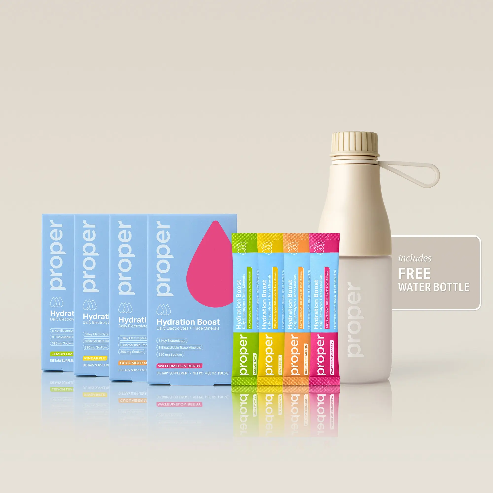 The Ultimate Hydration Bundle All four thirst-quenching flavors of Hydration Boost—and the perfect bottle to mix them in. What’s included: —15 stick packs of Pineapple Hydration Boost —15 stick packs of Lemon Lime Hydration Boost —15 stick packs of Cucumber Melon Hydration Boost —15 stick packs of Watermelon Berry Hydration Boost