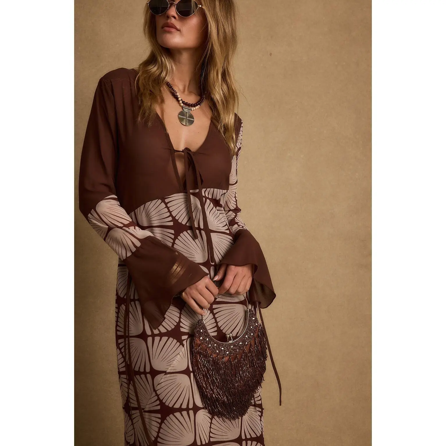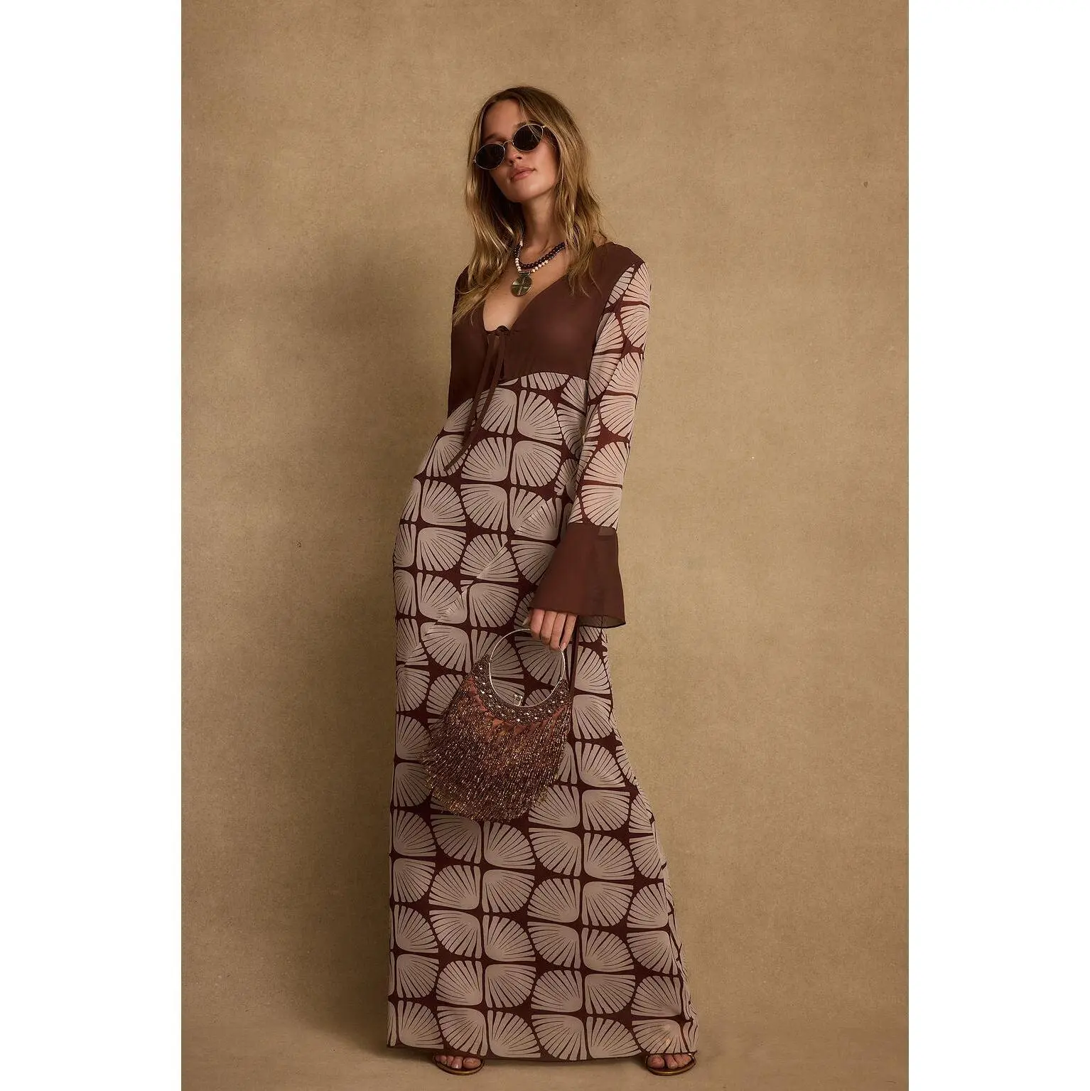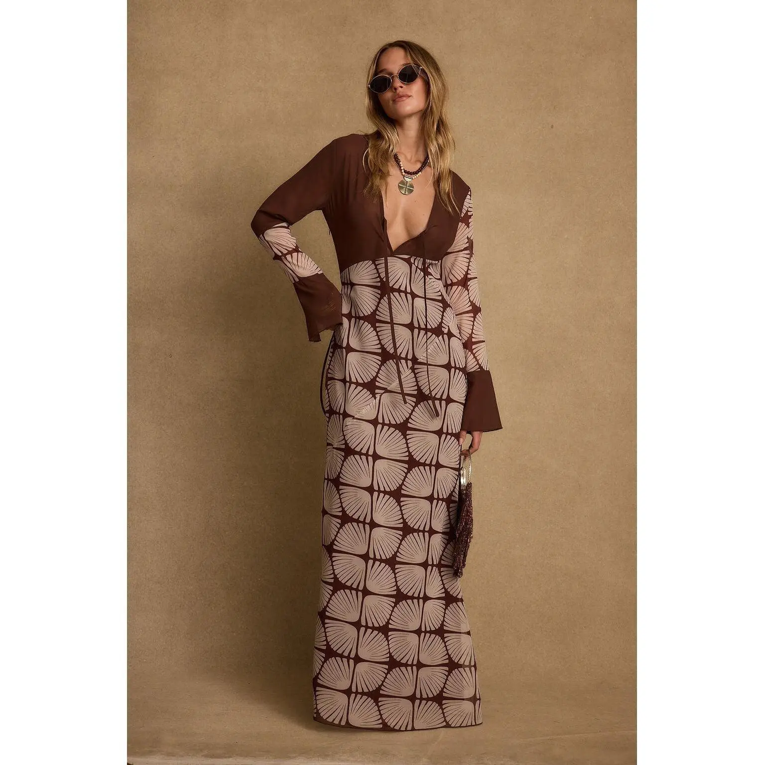 Thea Block Print Maxi Dress - Long Sleeve Lightweight Chiffon Vacation Chic Beach Cover Up All Seasons Fashion