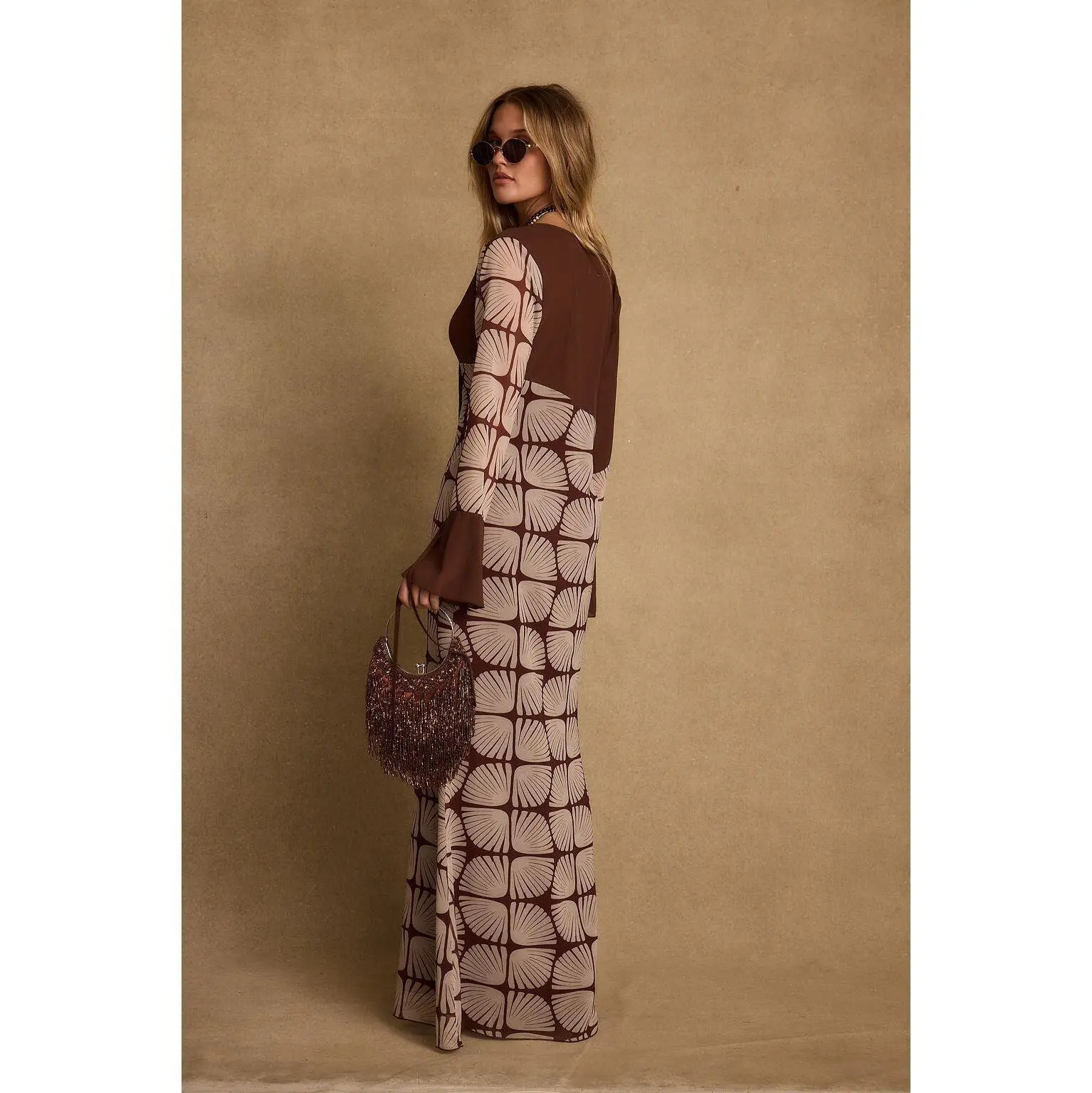 From yacht day to beach day, the Thea Block Print Maxi Dress does it all. Made from a lightweight chiffon material, mixing a rich brown and vacation inspired block print, the Thea effortlessly transitions from a chic cover up to a statement night-out look.