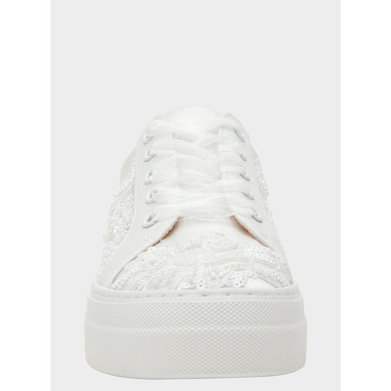 Brides, ditch the uncomfortable heels and grab these stunning beaded lace @Betsey Johnson platform sneakers. Not only are the beautiful, they are comfortable! #platformsneakers #bridesneakers #weddingshoes #tiktokshopcreatorpicks #spotlightfinds