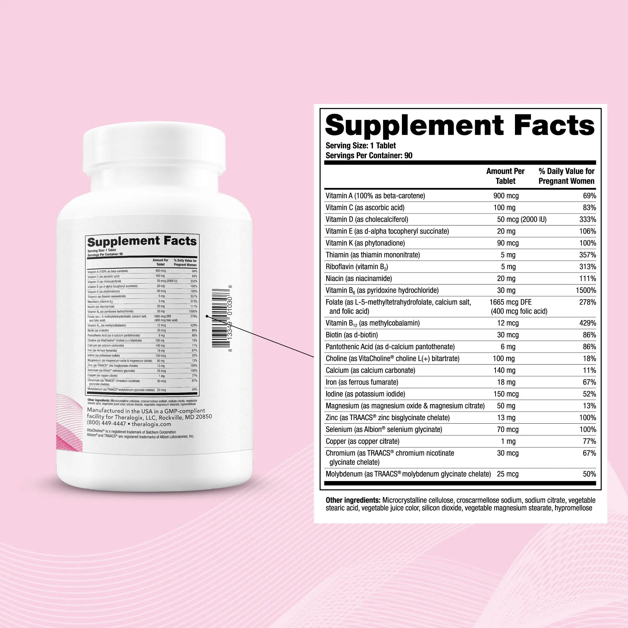 | Ingredients | Vitamin A 900mcg,vitamin C 100mg,vitamin D 50 mcg (2,000iu),vitamin E 20mg,vitamin K 90mcg,thiamin 5mg,riboflavin 5mg,niacin 20mg,vitamin B6 30mg,methylated folate 1,334mcg DFE,methylated vitamin B12 12mcg,biotin 30mcg,pantothenic acid 6mg,choline 100mg,calcium 140mg,iron 18mg,iodine 220mcg,magnesium 50mg,zinc 13mg,selenium 70mcg,copper 1mg,chromium 30mcg,molybdenum 50mcg. Other Ingredients: microcrystalline cellulose,croscarmellose sodium,sodium citrate,vegetable stearic acid,vegetable juice color,silicone dioxide,vegetable magnesium stearate,hypromellose. |