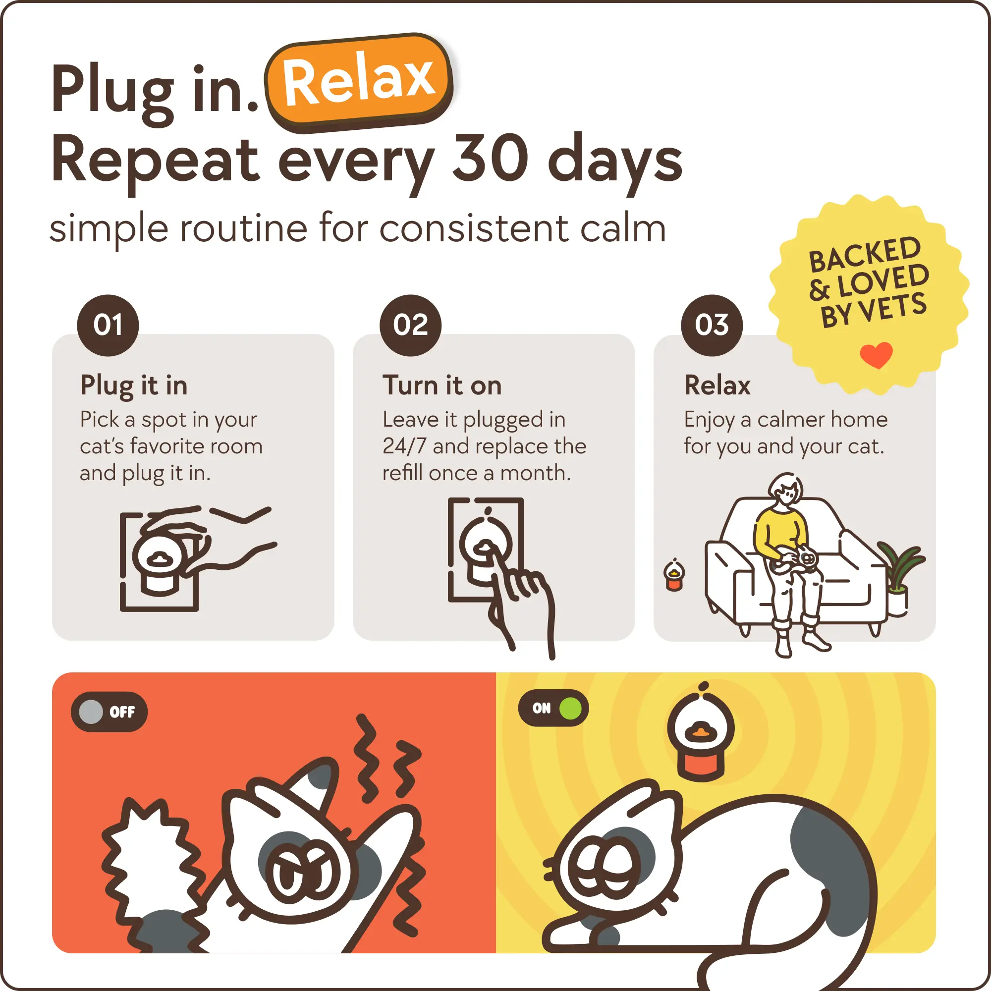 I re-ordered as my two cats ( 4 year old brothers - neutered) were driving me insane until I started using your diffusers. The bigger cat bullied his brother and took over his safe spaces by marking. It was horrible and I was at the point of considering rehoming him. They still have their brotherly spats. But most of the time - so far - harmony has been restored - thank you so much.