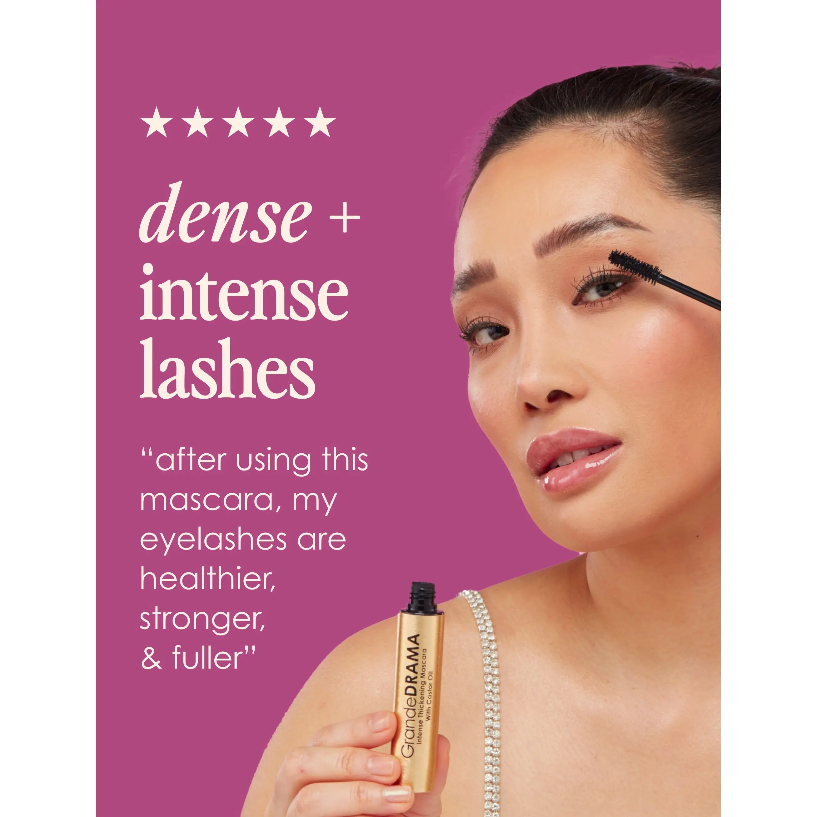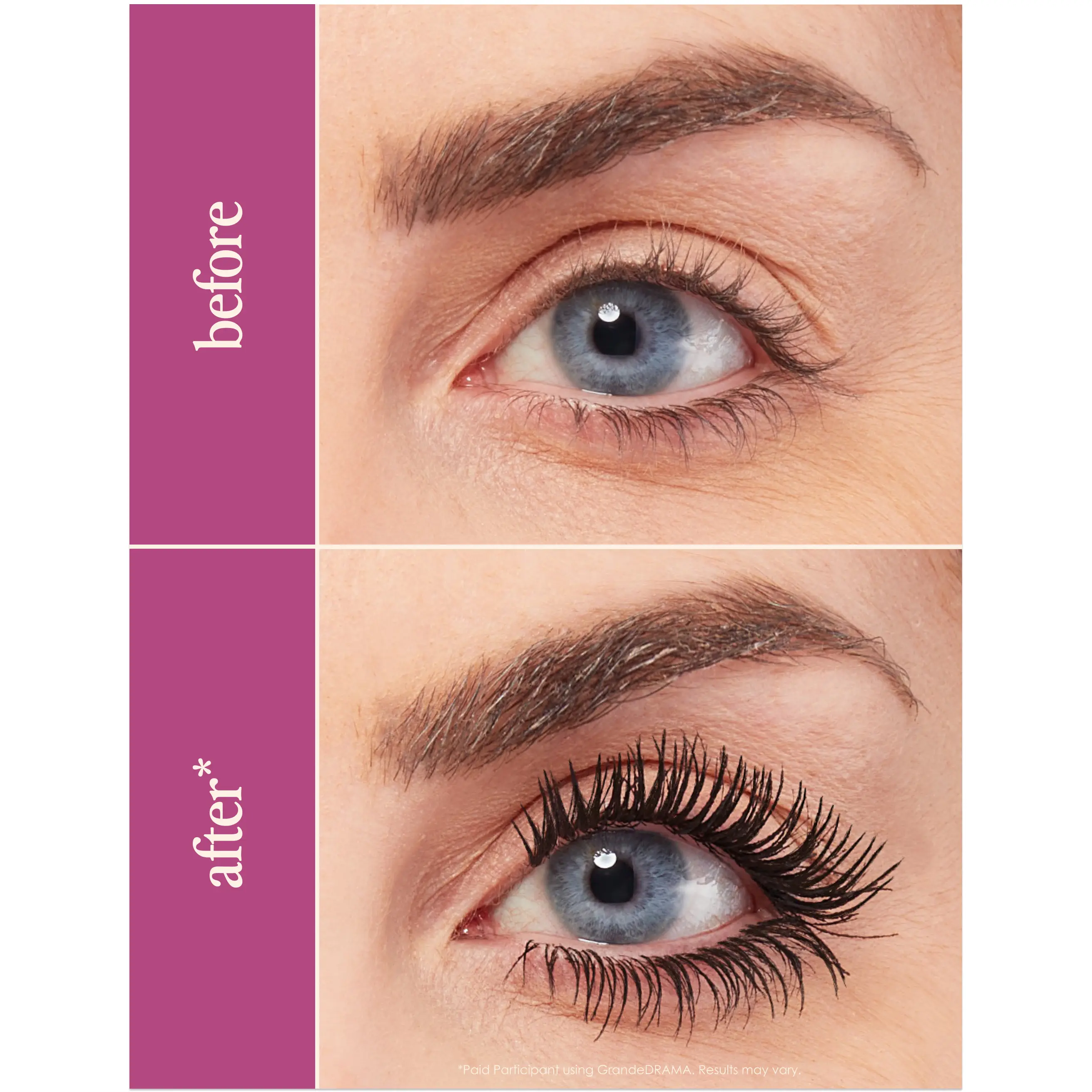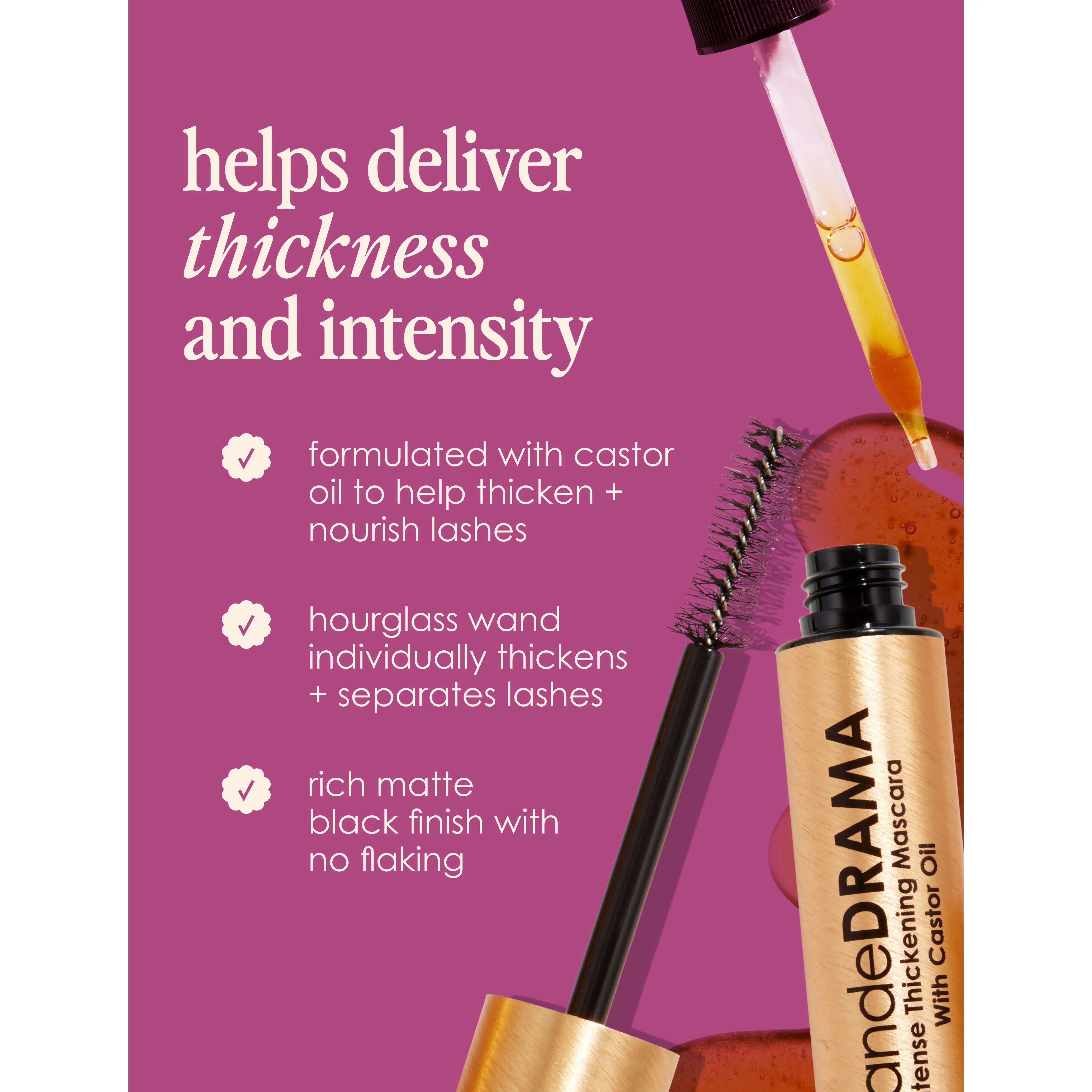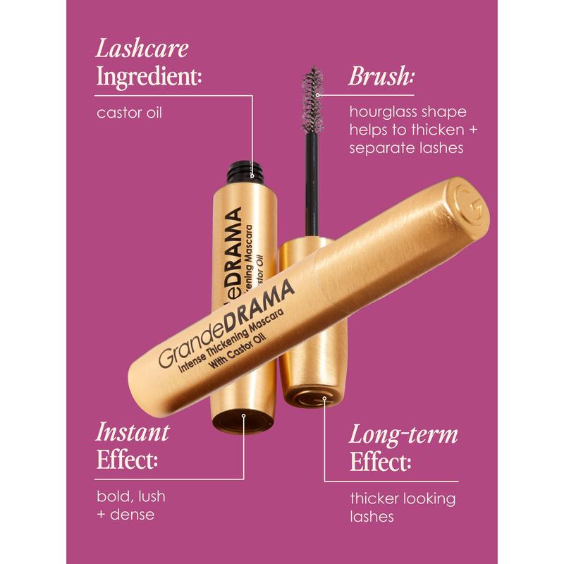 Say goodbye to thin, wimpy lashes! GrandeDRAMA is an intense thickening mascara infused with castor oil to promote lush, dense looking lashes with unbeatable shine and glossiness. Its unique, buildable formula instantly lifts, lengthens, and adds volume like never before. Designed to combat clumping, the subtle hourglass shaped brush is not overly dense, allowing you to work the formula in between lashes to individually thicken and separate each and every lash.