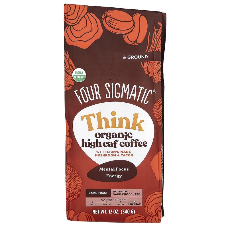 Four Sigmatic Think, Organic High Caf Coffee with Lion's Mane Mushroom & Yacon, Ground, Dark Roast, 12 oz (340 g)