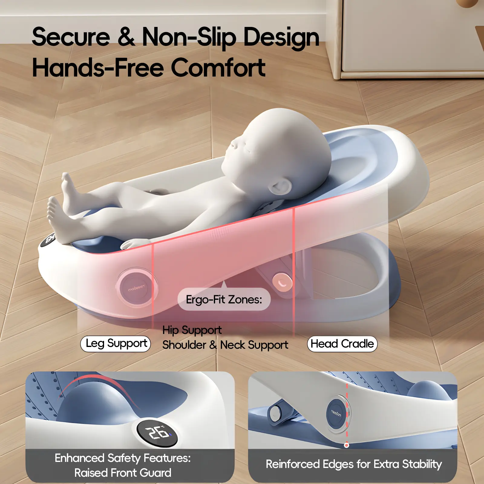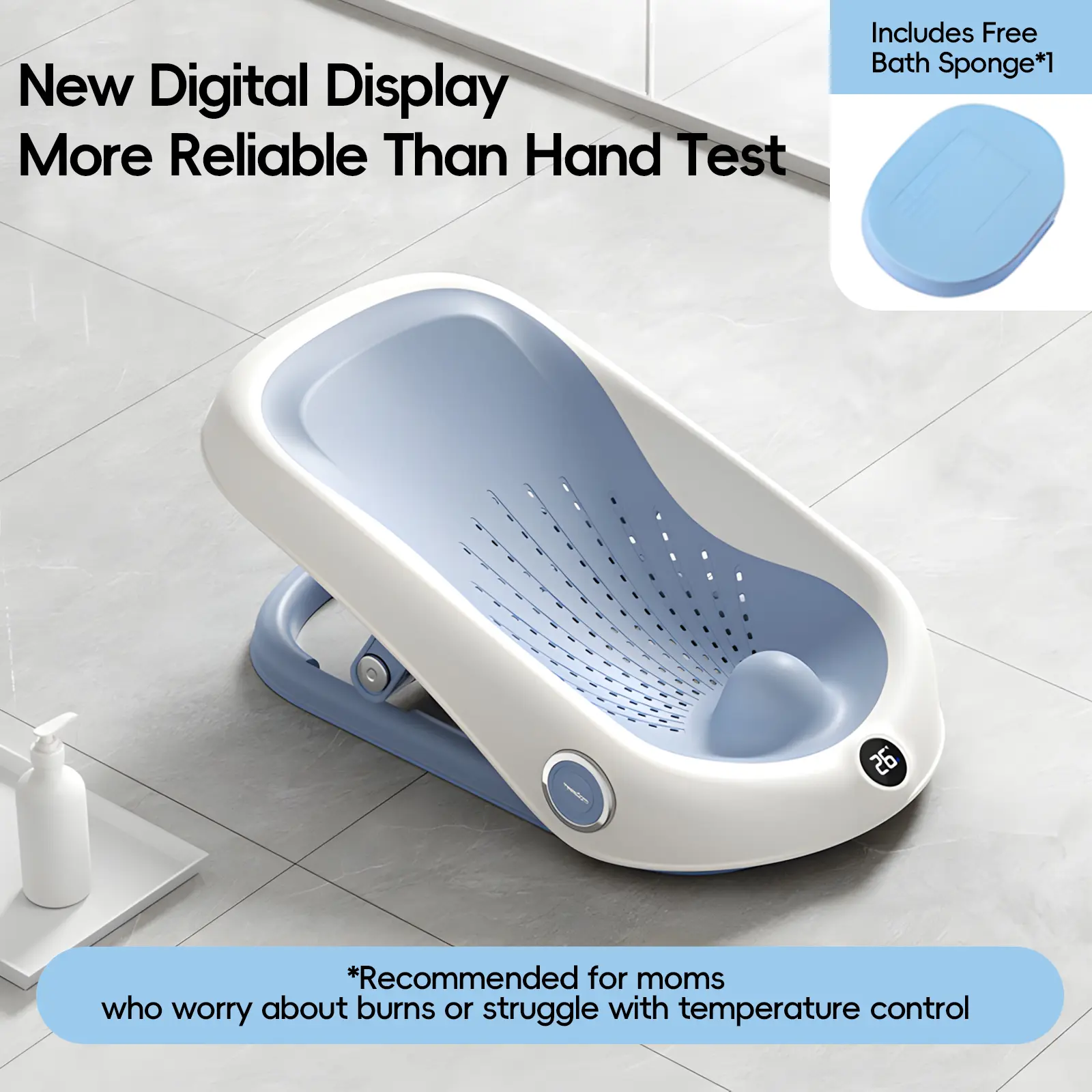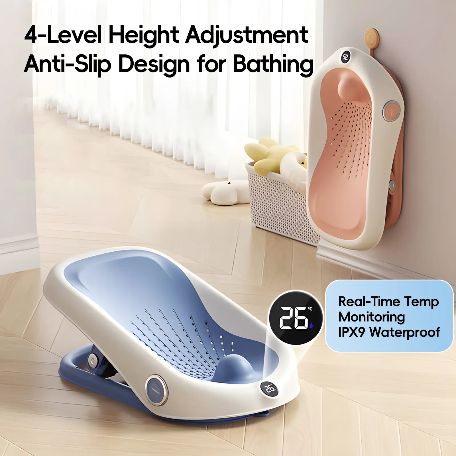 Our Baby Bath Support for newborns comes with a smart digital thermometer. It displays real-time water temperature and uses color alerts for safety. If the water is too cold or too hot, it warns you. This ensures your baby's bath is at the ideal temperature, providing a safe and worry-free experience.