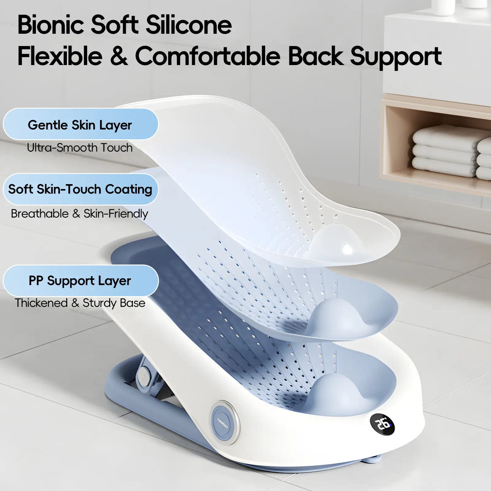 The recliner has a sturdy, non-slip base that keeps it firmly in place. This added stability ensures your baby's safety during bath time. The soft, skin-friendly materials are crafted from non-irritating silicone, providing a gentle surface for your baby's delicate skin.